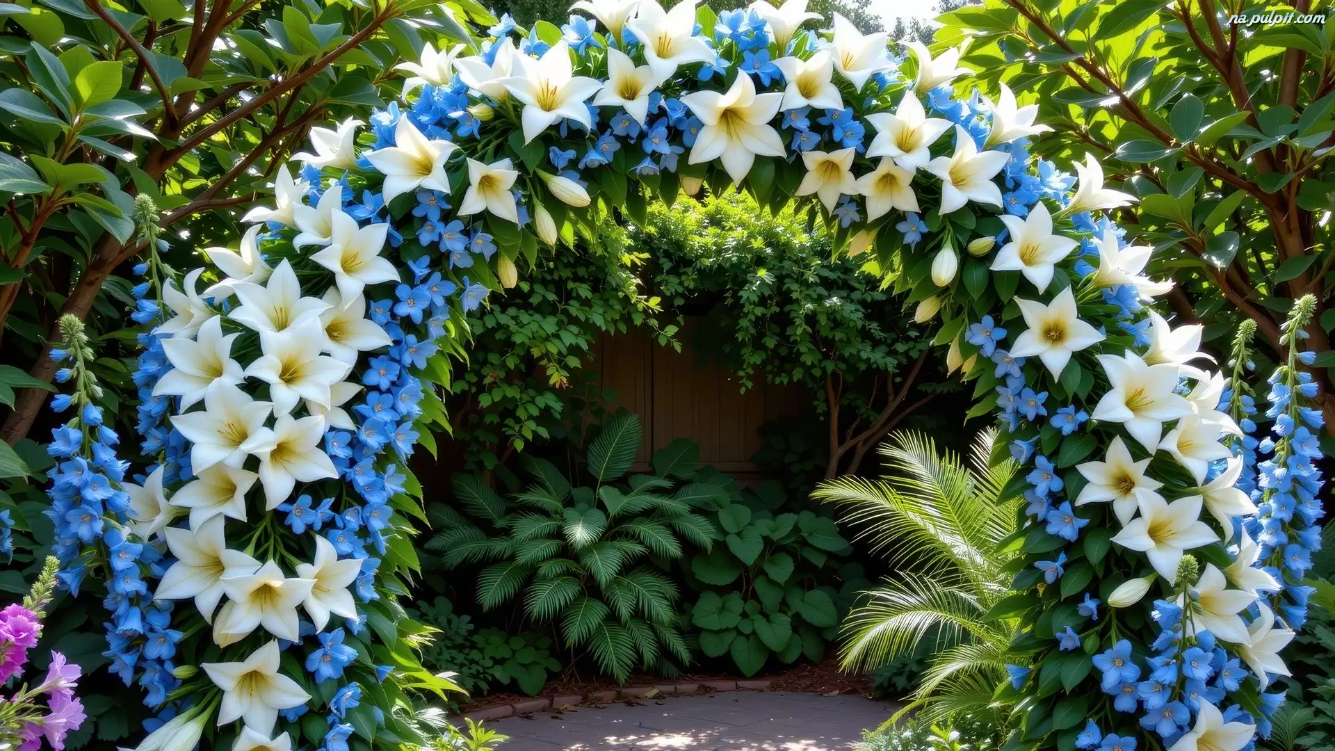 Rośliny, Białe, Niebieskie, Ogród, Kwiatowy, Łuk, Kwiaty Na Pulpit