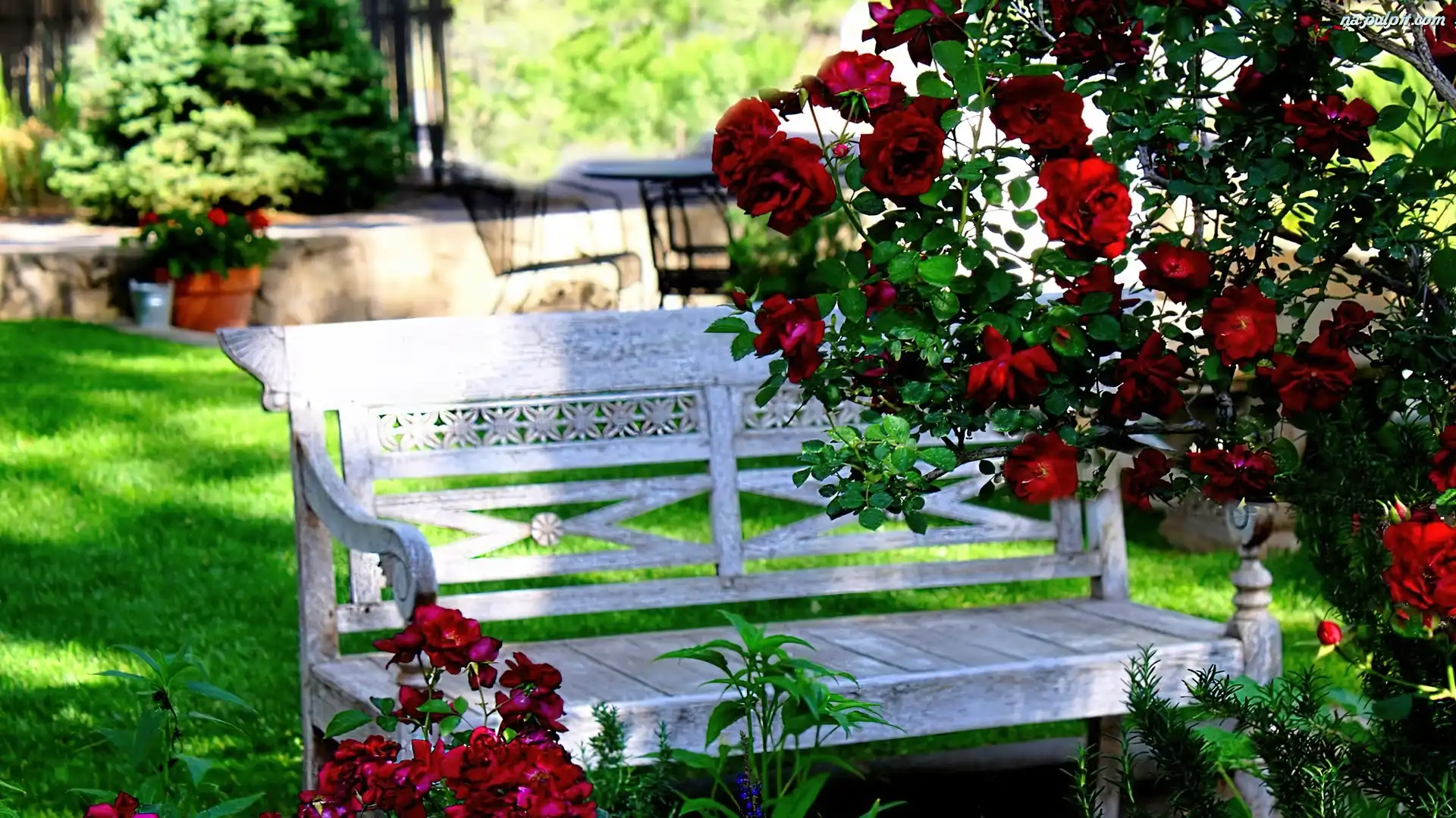 Ogród, Biała, Róże, Ławka