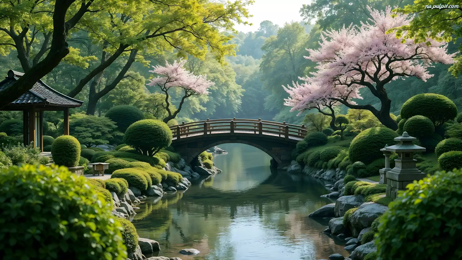 Drzewa, Ogród, Rzeka, Krzewy, Mostek Na Pulpit