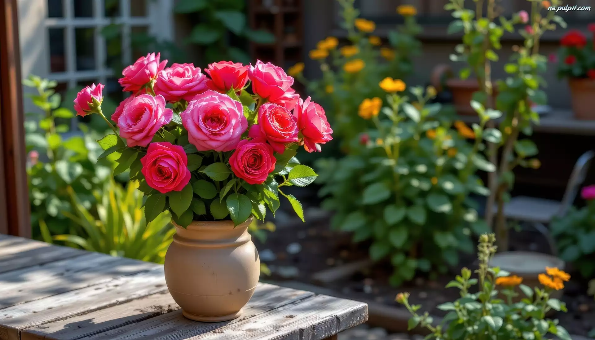 Grafika AI, Stół, Wazon, Kwiaty, Różowe, Róże, Ogród Na Pulpit