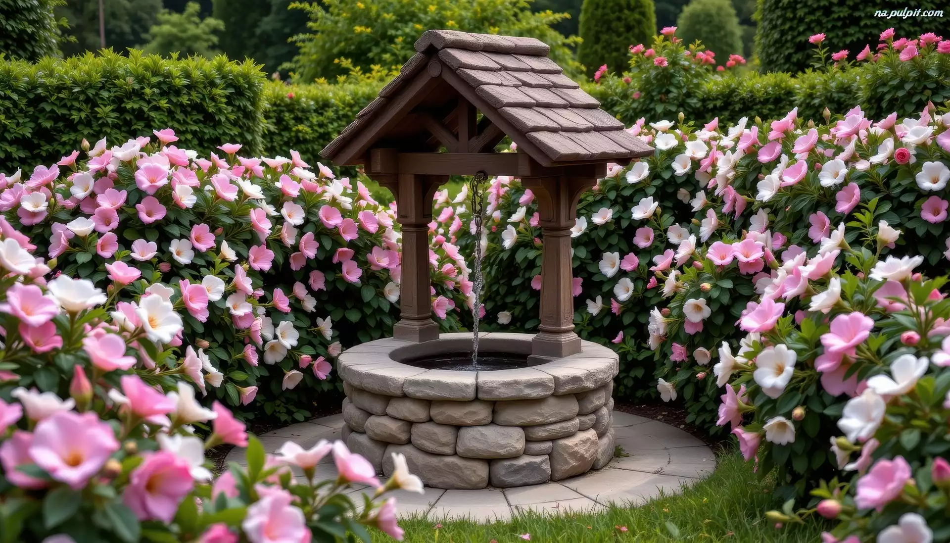 Białe, Ogród, Studnia, Różowe, Kwiaty