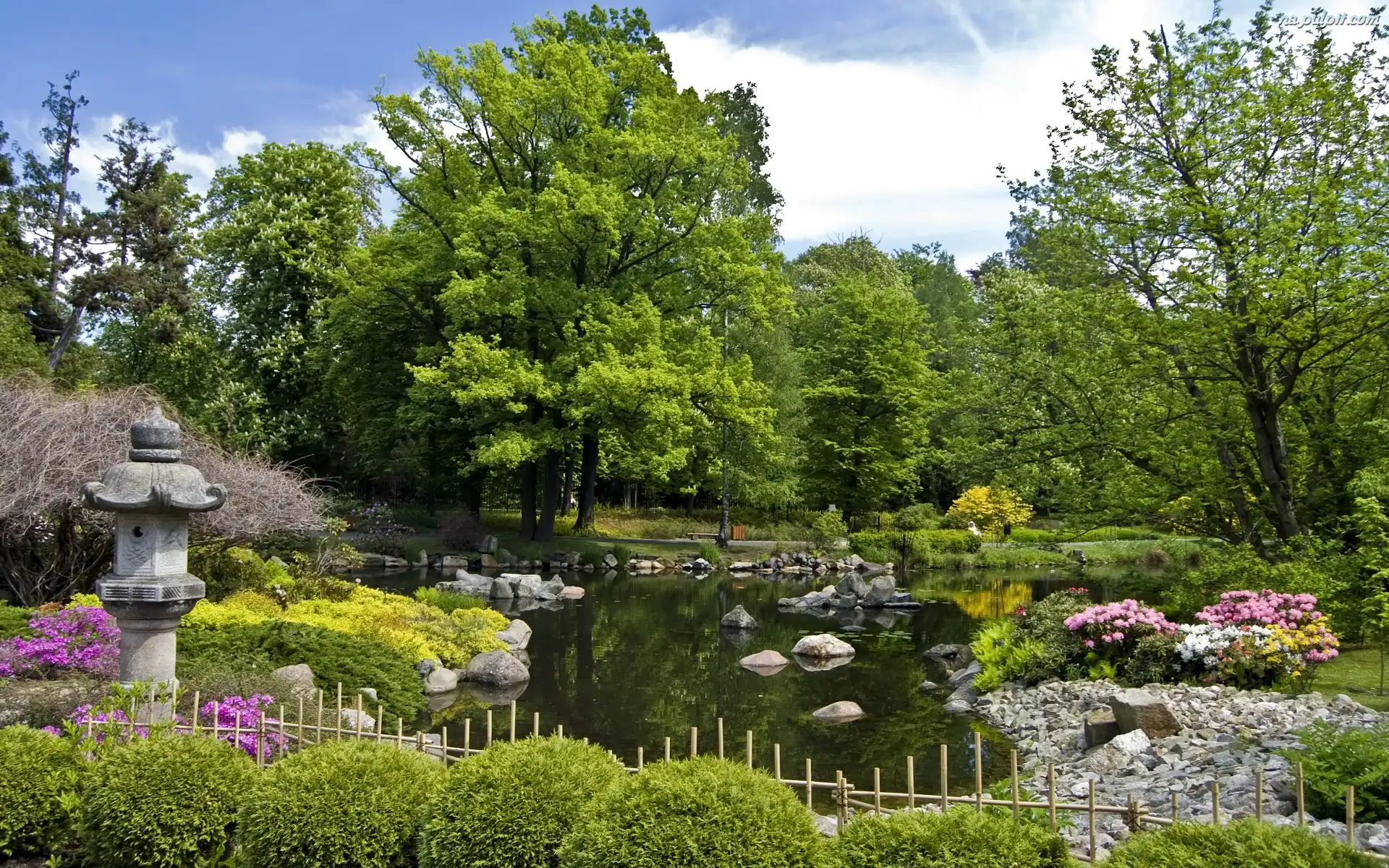 Ogród, Japoński Drzewa, Japonia, Dom Gitary, Wysepka, Kształt Kwiaty, Żółte, Ogród, Liliowe ludzie, Drzewo, Lato, Góry, Krzew Rower, Pole Nad morzem, Zachód, Słońce Plantacja, Bananów Hawaje, Tropikalna, Laguna Róże, Ogród Roślinność, Basen, Fontanna Rośliny, Ogród, Zielone Ławka, Lasek, Dróżka Ogród, Azalie, Różowe, Japoński