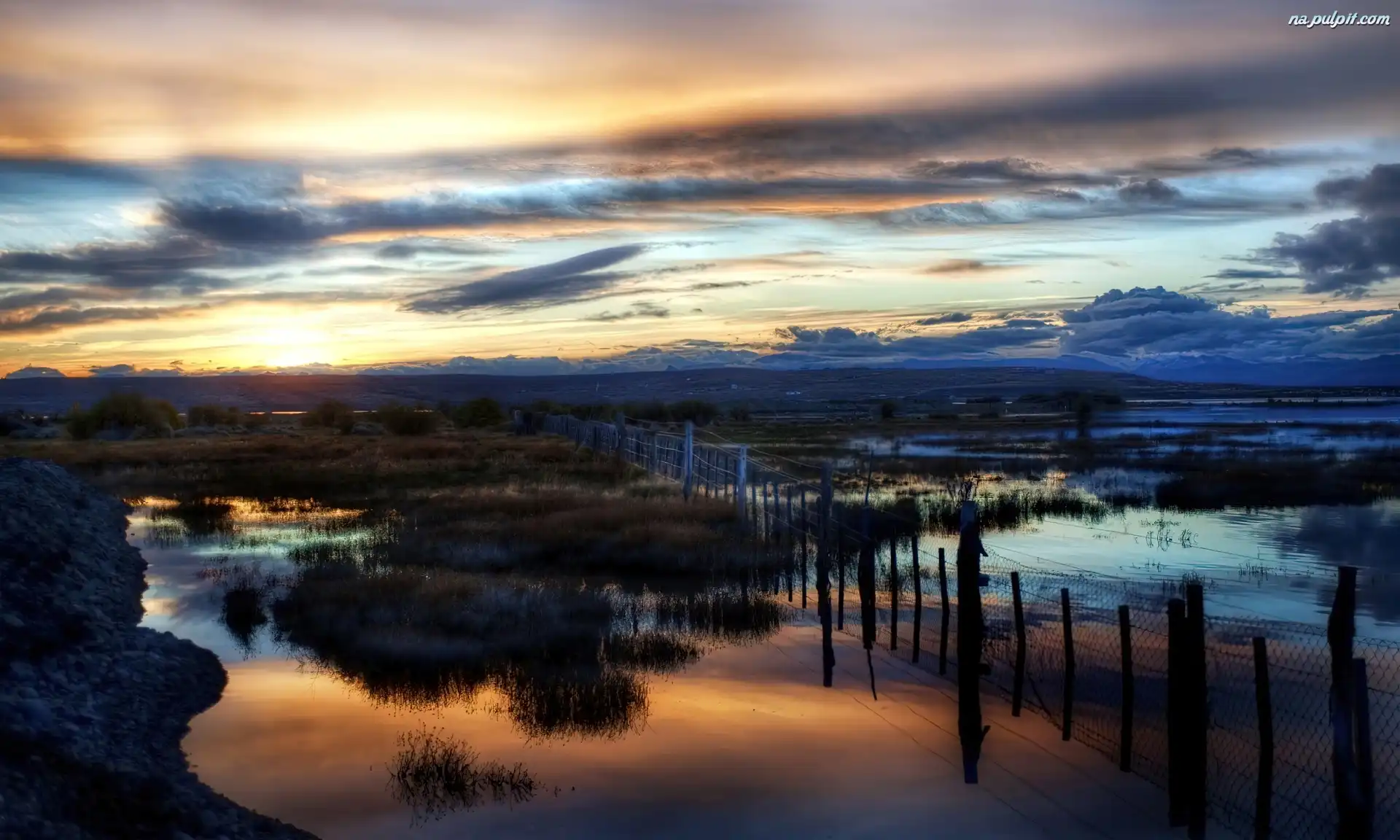 Ogrodzenie, Zalane, Zmrok, Chmury, Łąki Na Pulpit