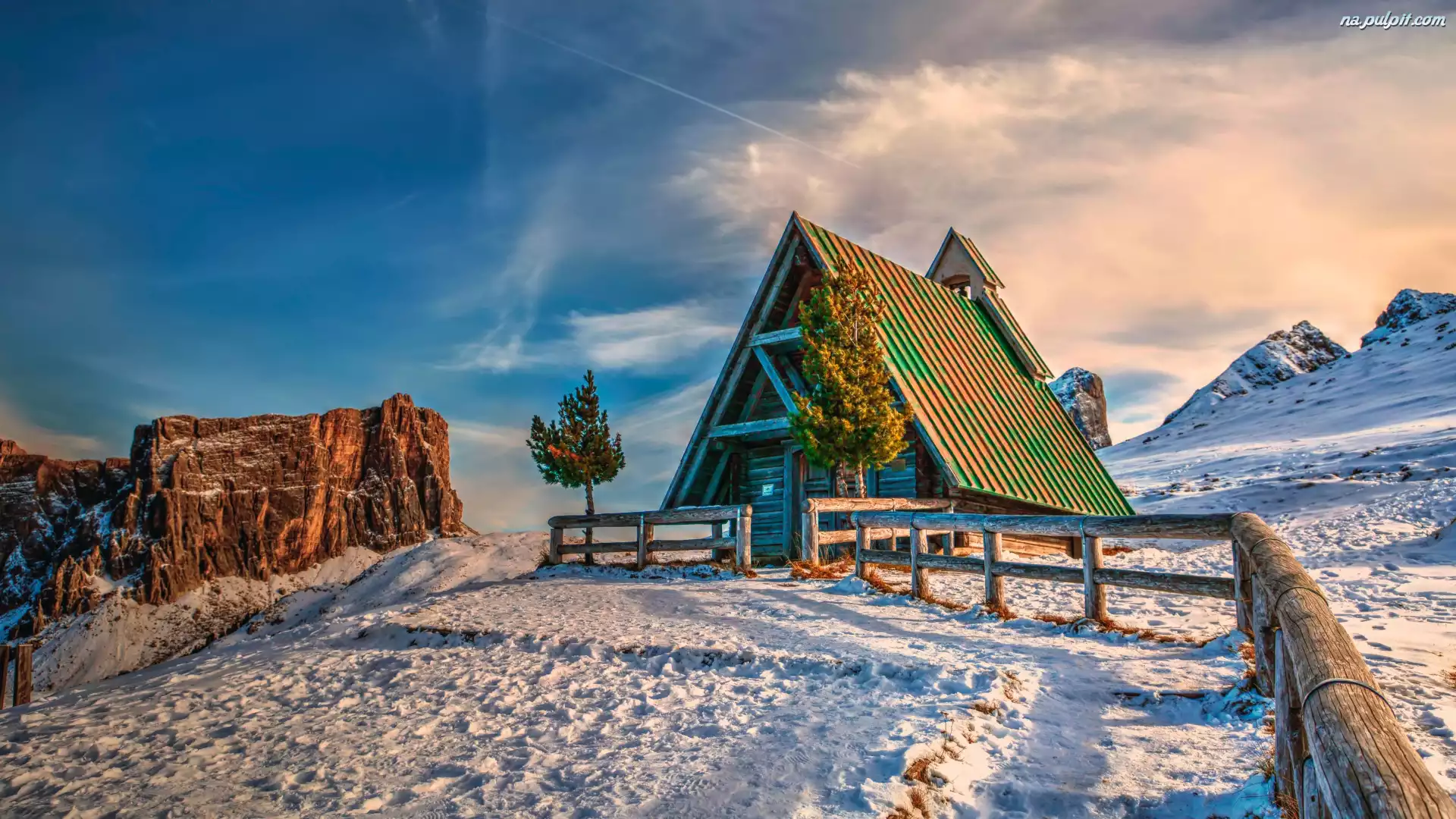 Chmury, Góry, Zima, Dolomity, Dom, Skały, Włochy, Śnieg, Ogrodzenie, Drzewa Na Pulpit