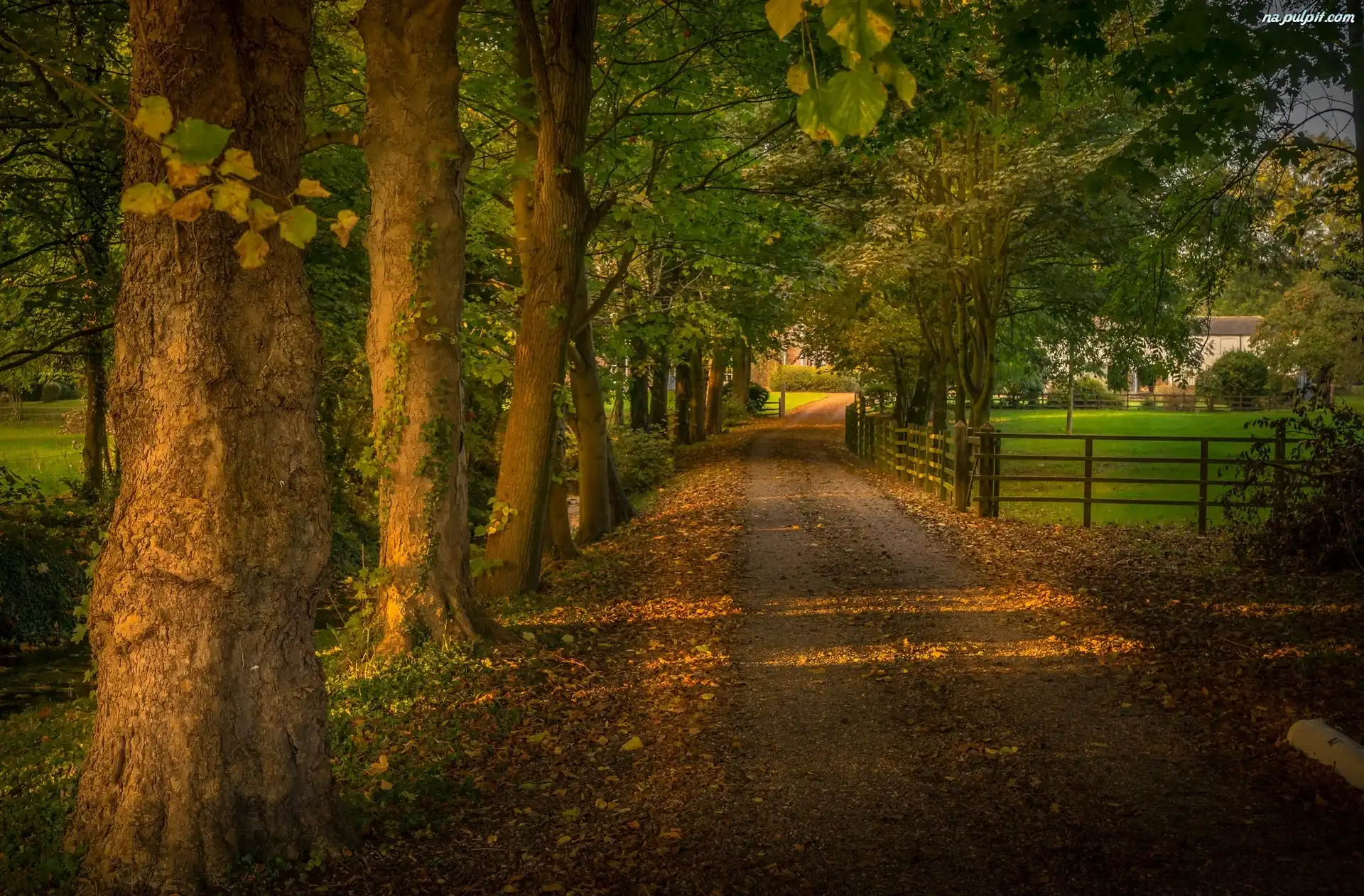 Ogrodzenie, Drzewa, Park, Jesień, Droga