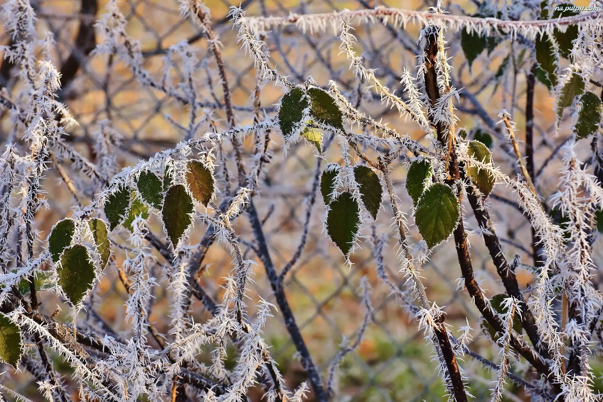 Ogrodzenie, Gałązki, Szron, Liście Na Pulpit