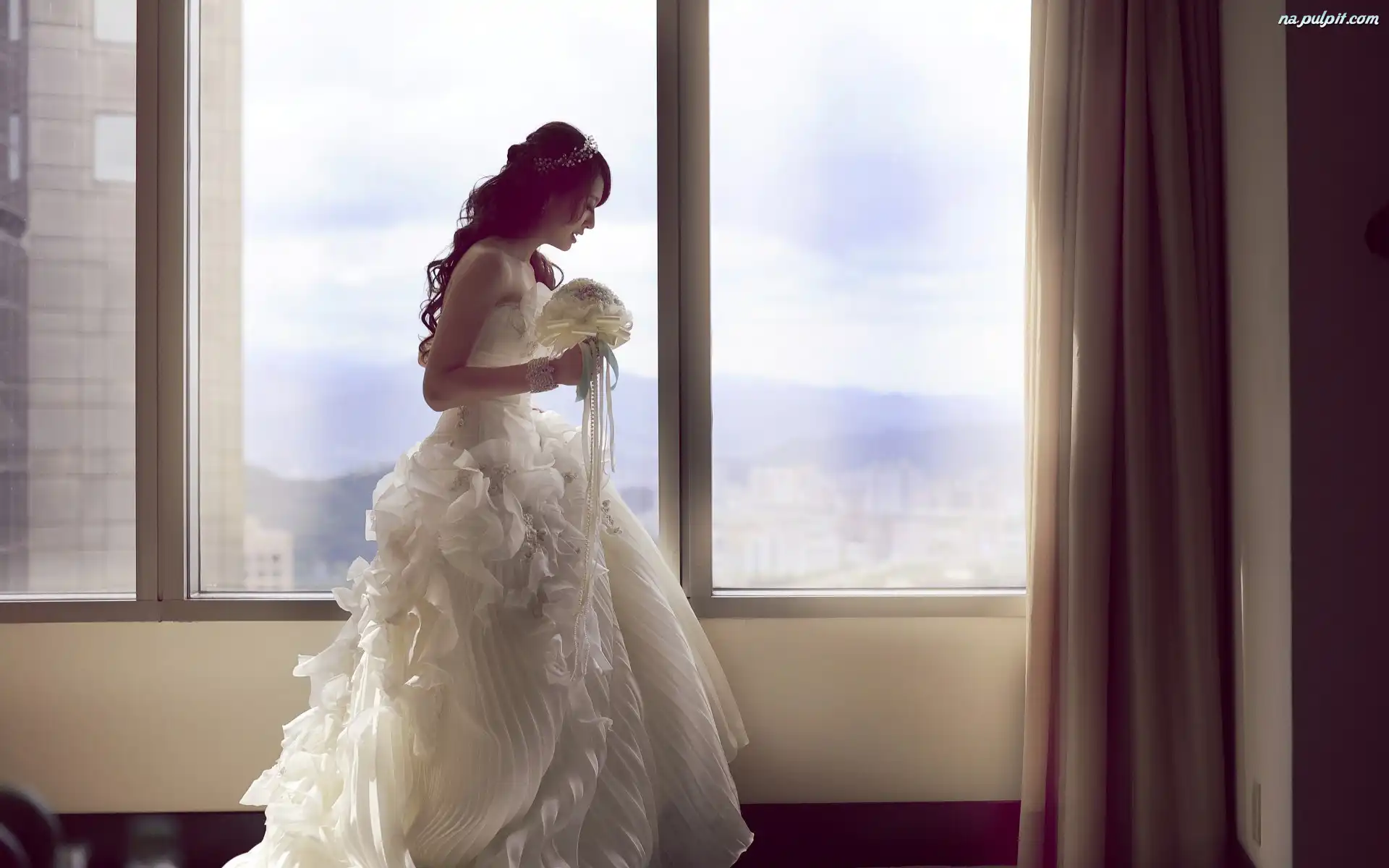 Okna, Suknia biała, Ślub, Kobieta, Bukiet Na Pulpit