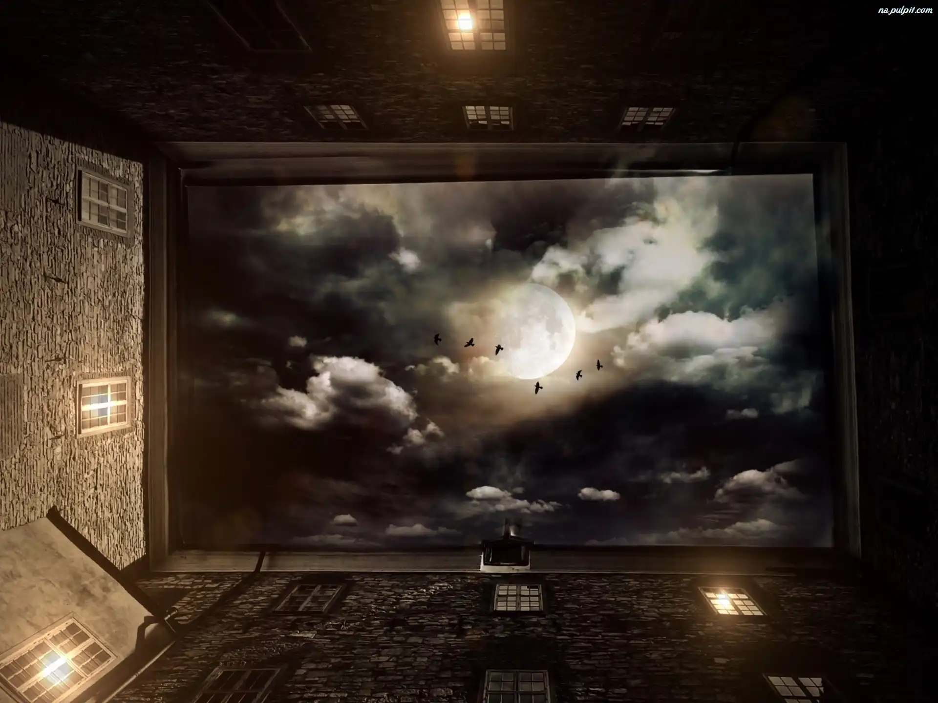 Okna, Księżyc, Niebo, Noc, Dziedziniec Na Pulpit