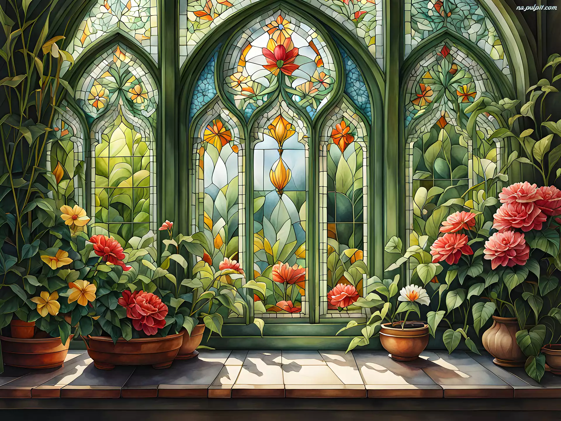 Witraże, Kwiaty, Parapet, Okno, Doniczki, 2D Na Pulpit