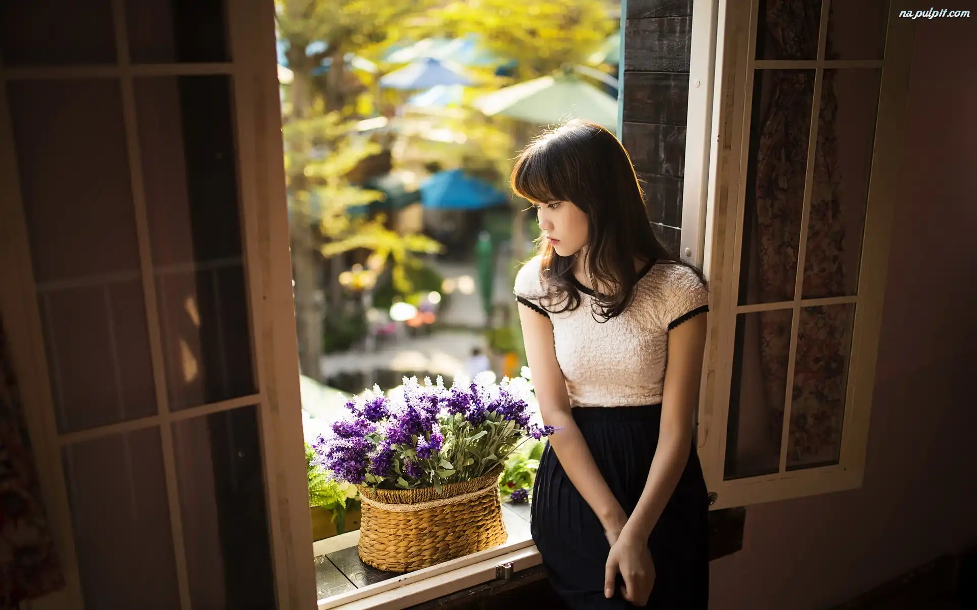 Okno, Koszyk, Dziewczyna, Brunetka, Kwiaty Na Pulpit