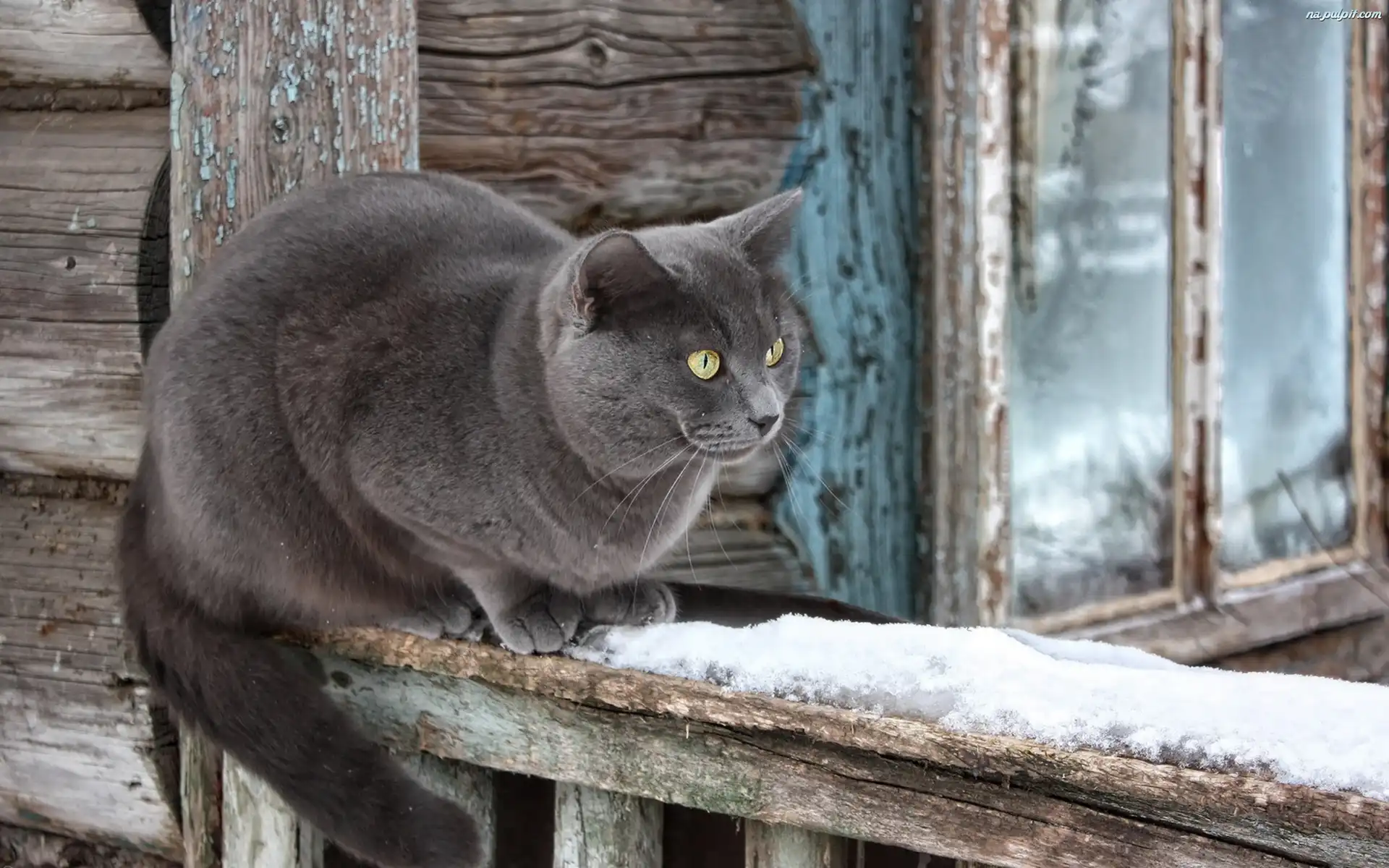 Okno, Drewniana, Zima, Kot brytyjski, Poręcz