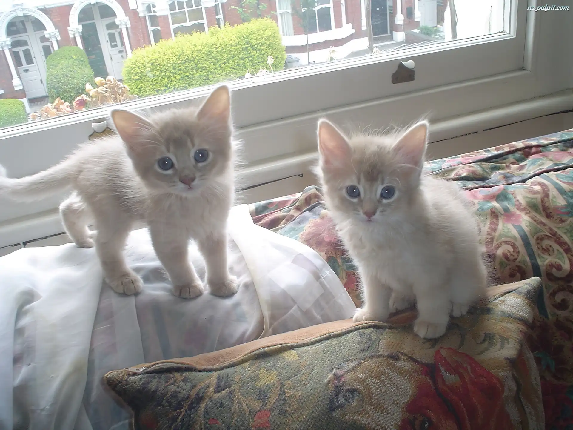 Okno, Kotki, Białe, Dwa, Poduszki Na Pulpit