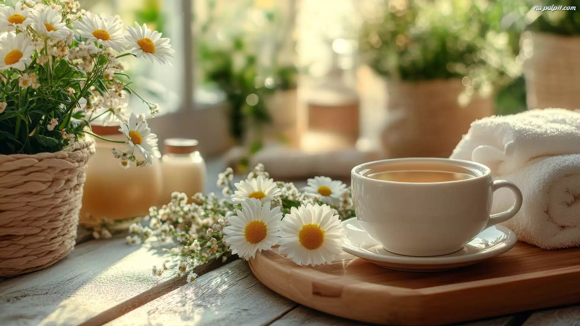 Okno, Kompozycja, Herbata, Kwiaty, Stokrotki, Taca, Filiżanka, Stół, Ręcznik Na Pulpit