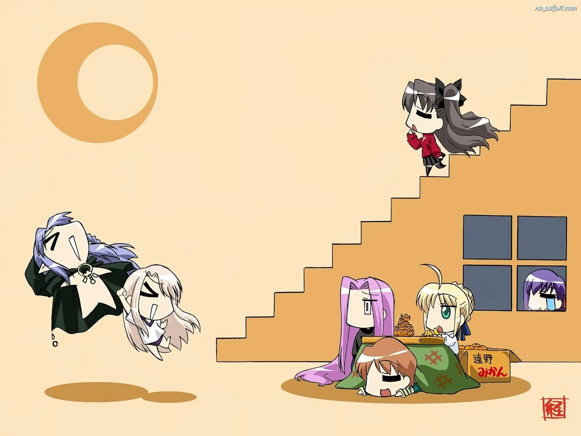 karton, okno, ludzie, schody, Fate Stay Night Na Pulpit