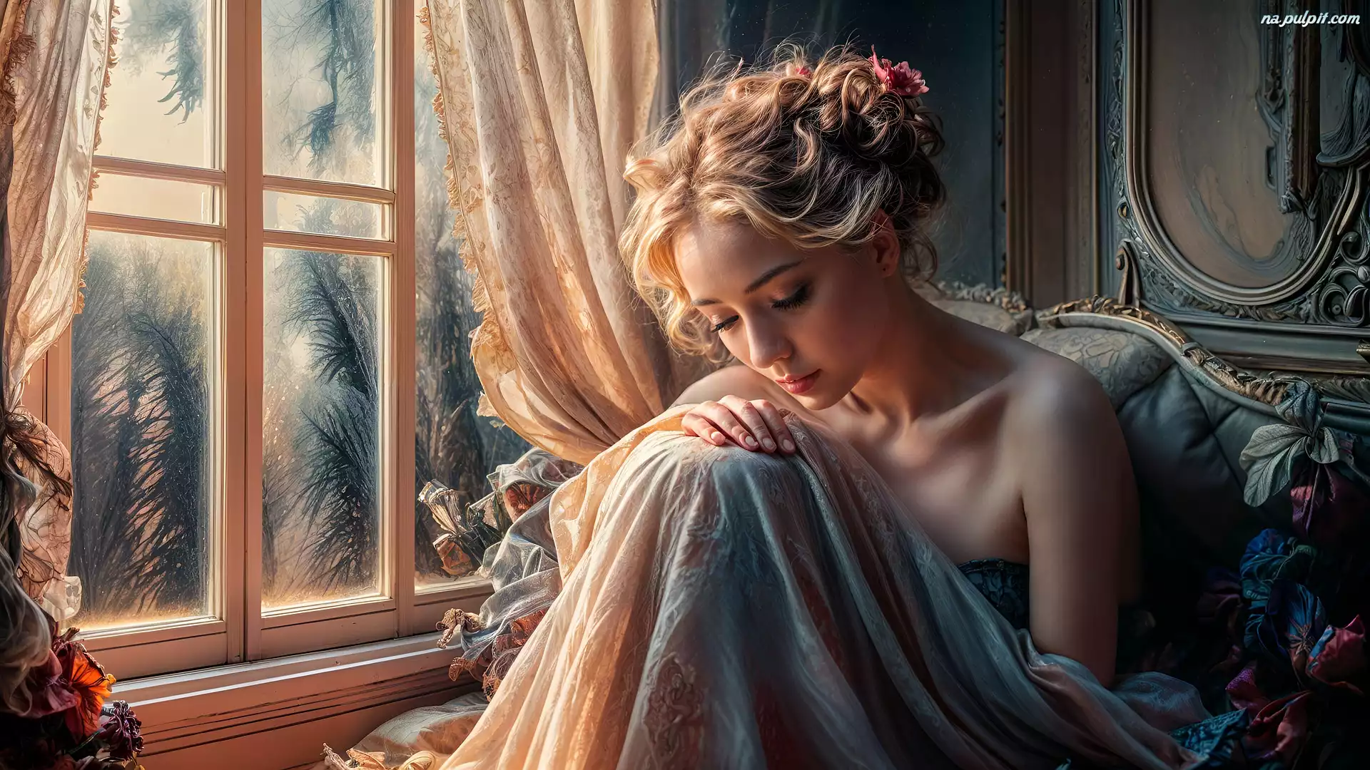 Kobieta, Smutna, Fotel, Okno Na Pulpit