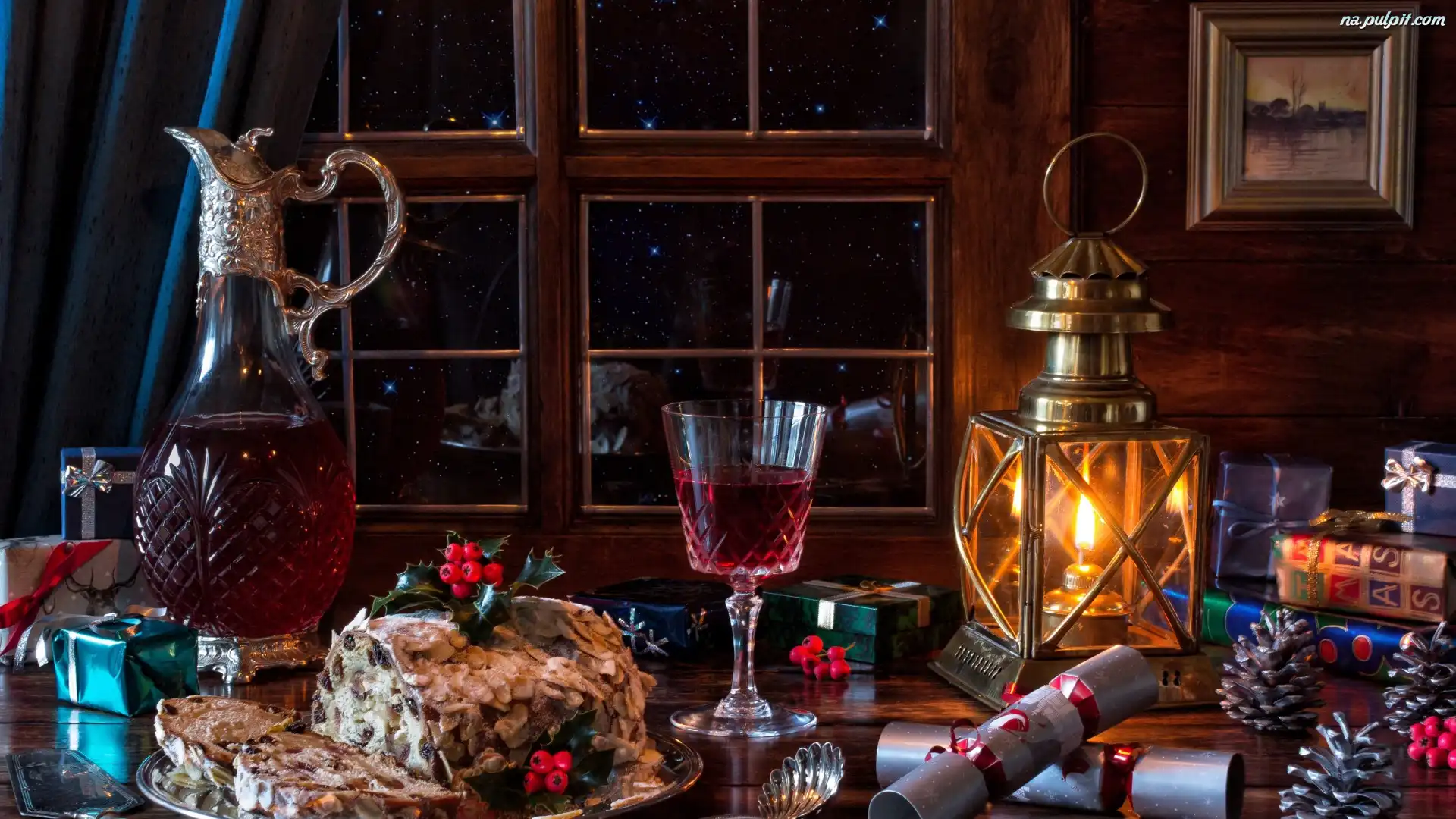 Prezenty, Boże Narodzenie, Dzban, Wino, Ciasto, Lampion, Kieliszek, Kompozycja, Okno Na Pulpit