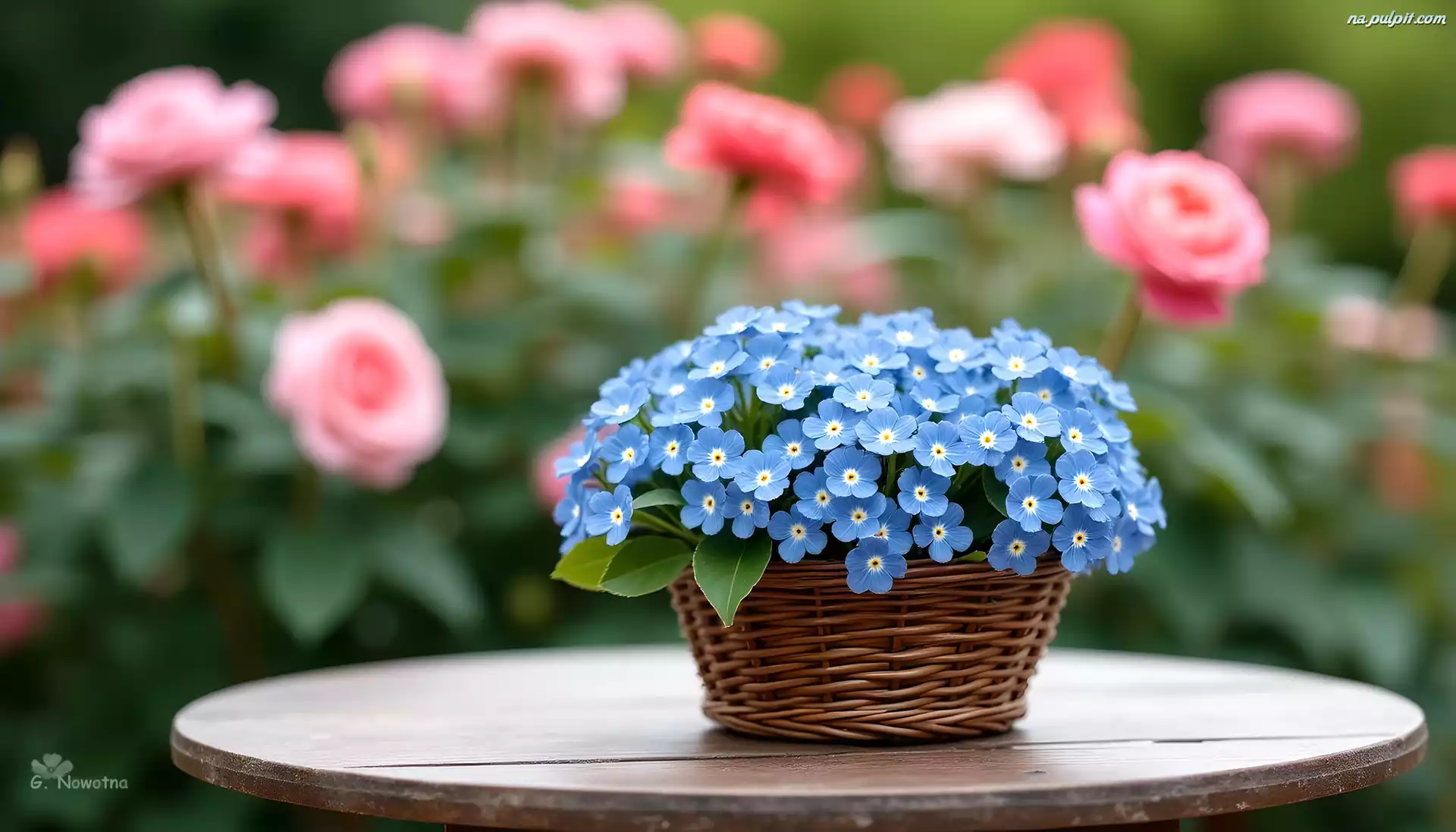 Stolik, Niebieskie, Koszyk, Okrągły, Kwiaty, Grafika Na Pulpit