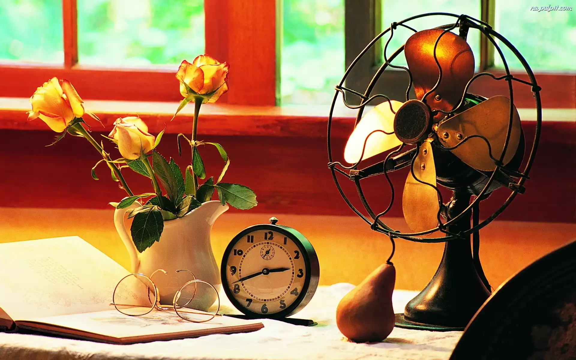 Okulary, Wazon, Wentylator, Zegarek, Książka, Kwiaty Na Pulpit