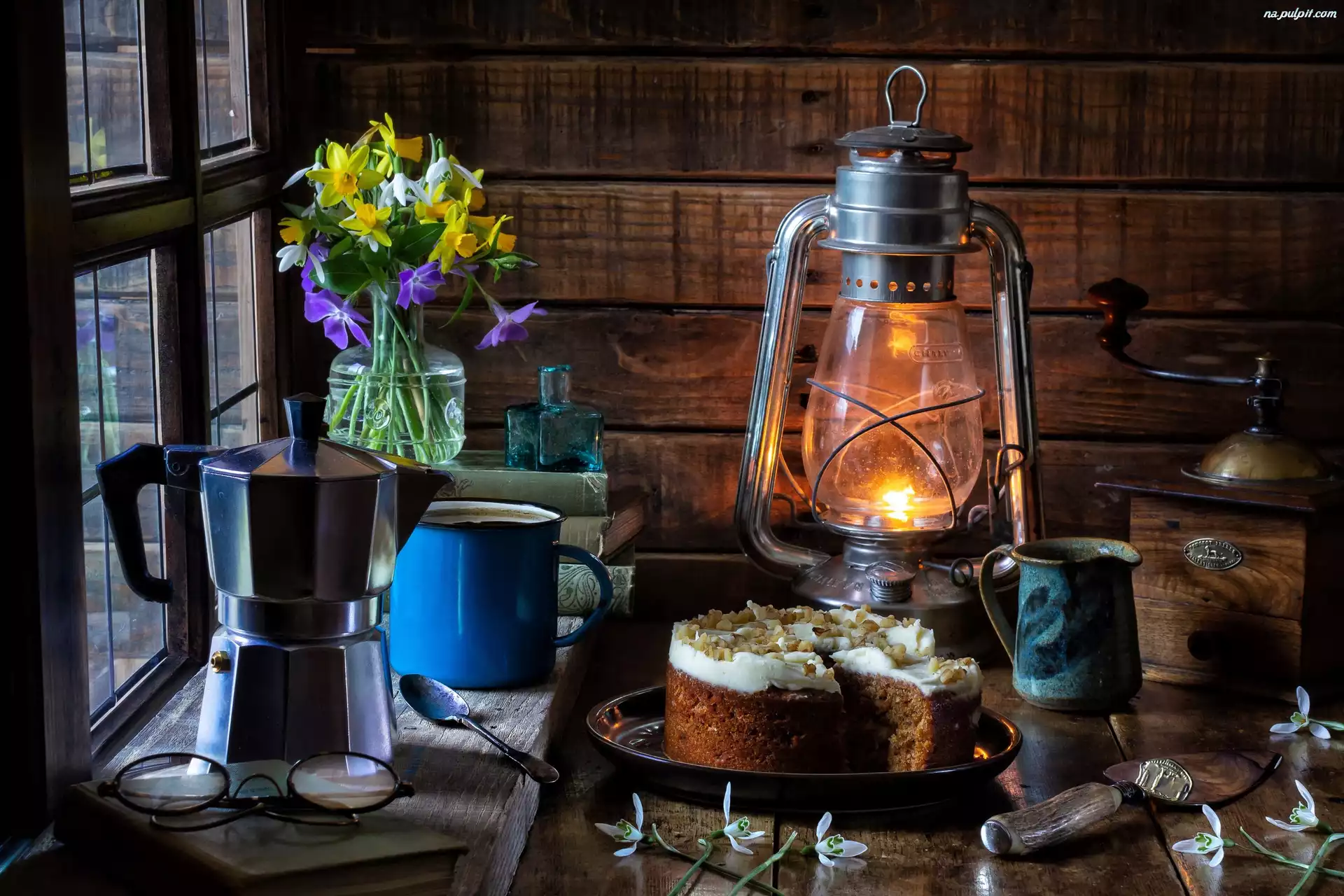 Kompozycja, Lampa naftowa, Czajnik, Młynek, Parapet, Okno, Kwiaty, Ciasto, Okulary