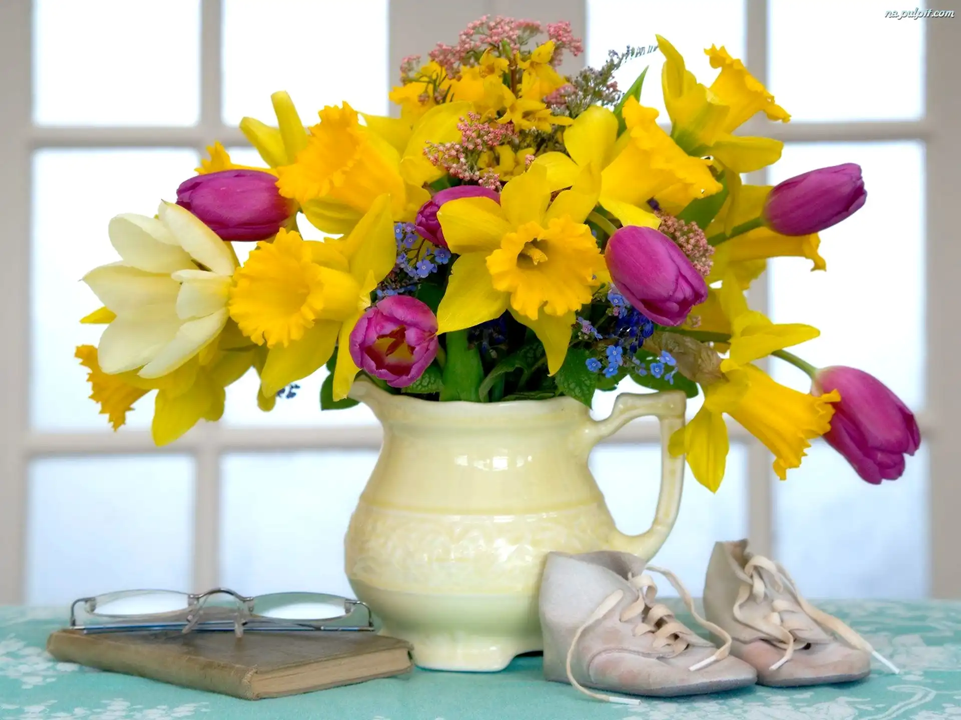 Okulary, Żonkile, Tulipany, Buciki Na Pulpit