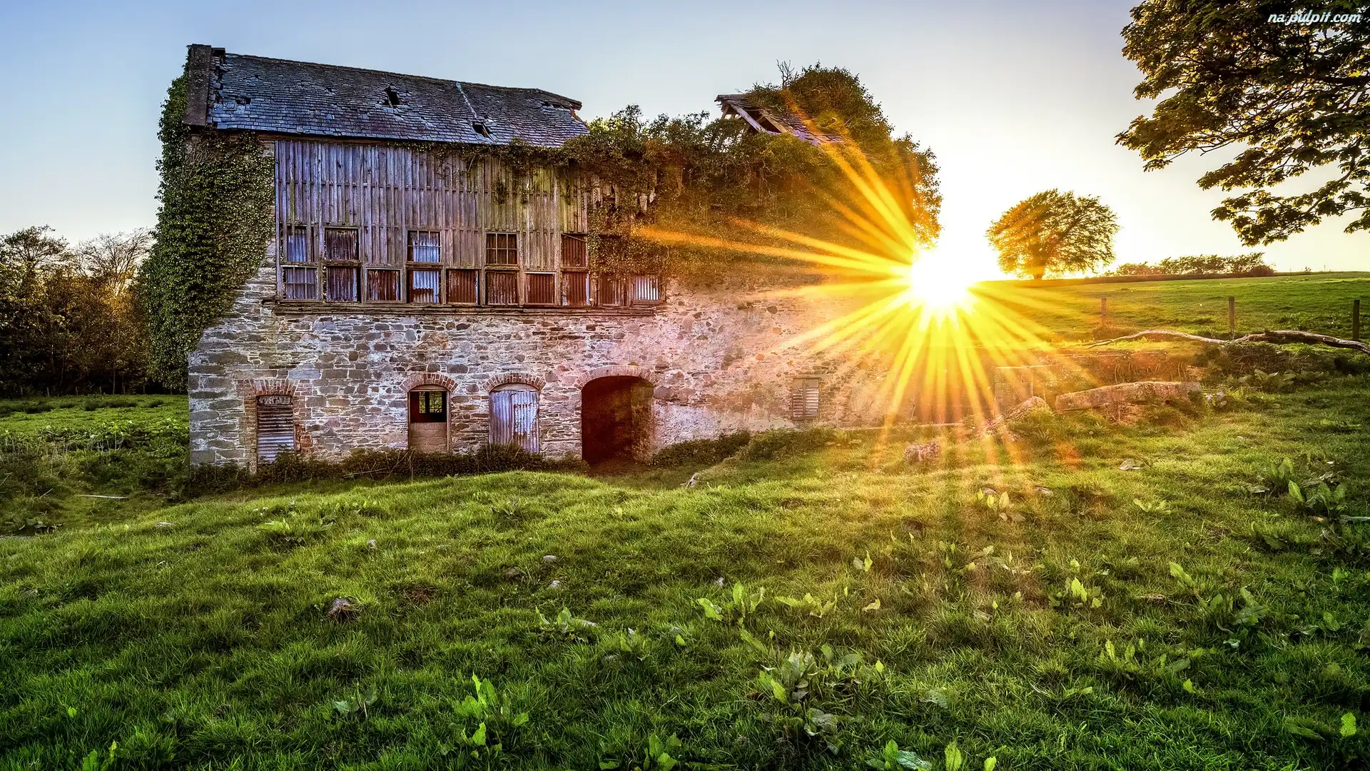 Młyn, Hrabstwo Tyrone, Irlandia Północna, Old Leckpatrick Corn Mill, Promienie słońca, Artigarvan Na Pulpit |