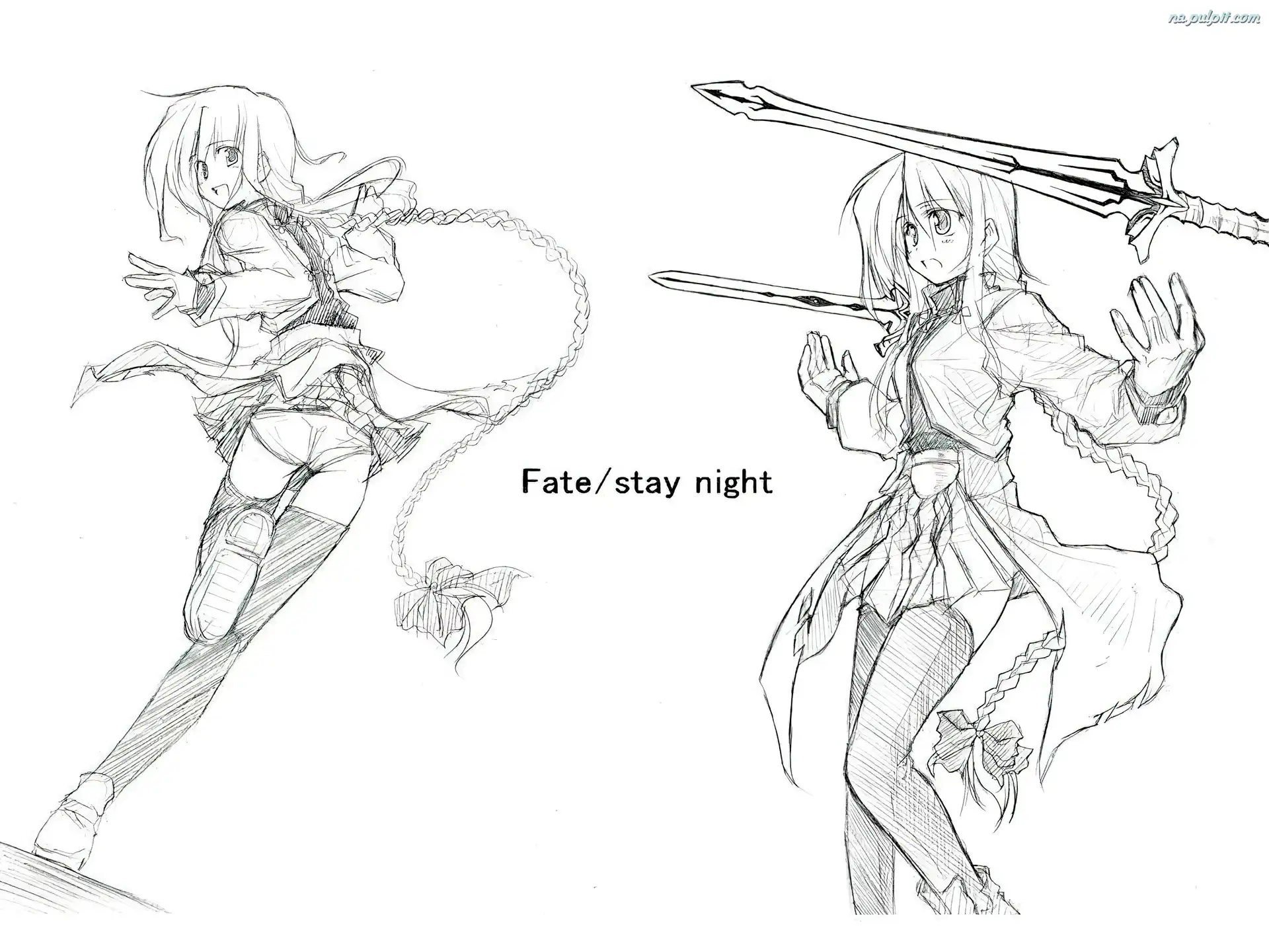 miecze, ołówek, szkic, Fate Stay Night, kobiety