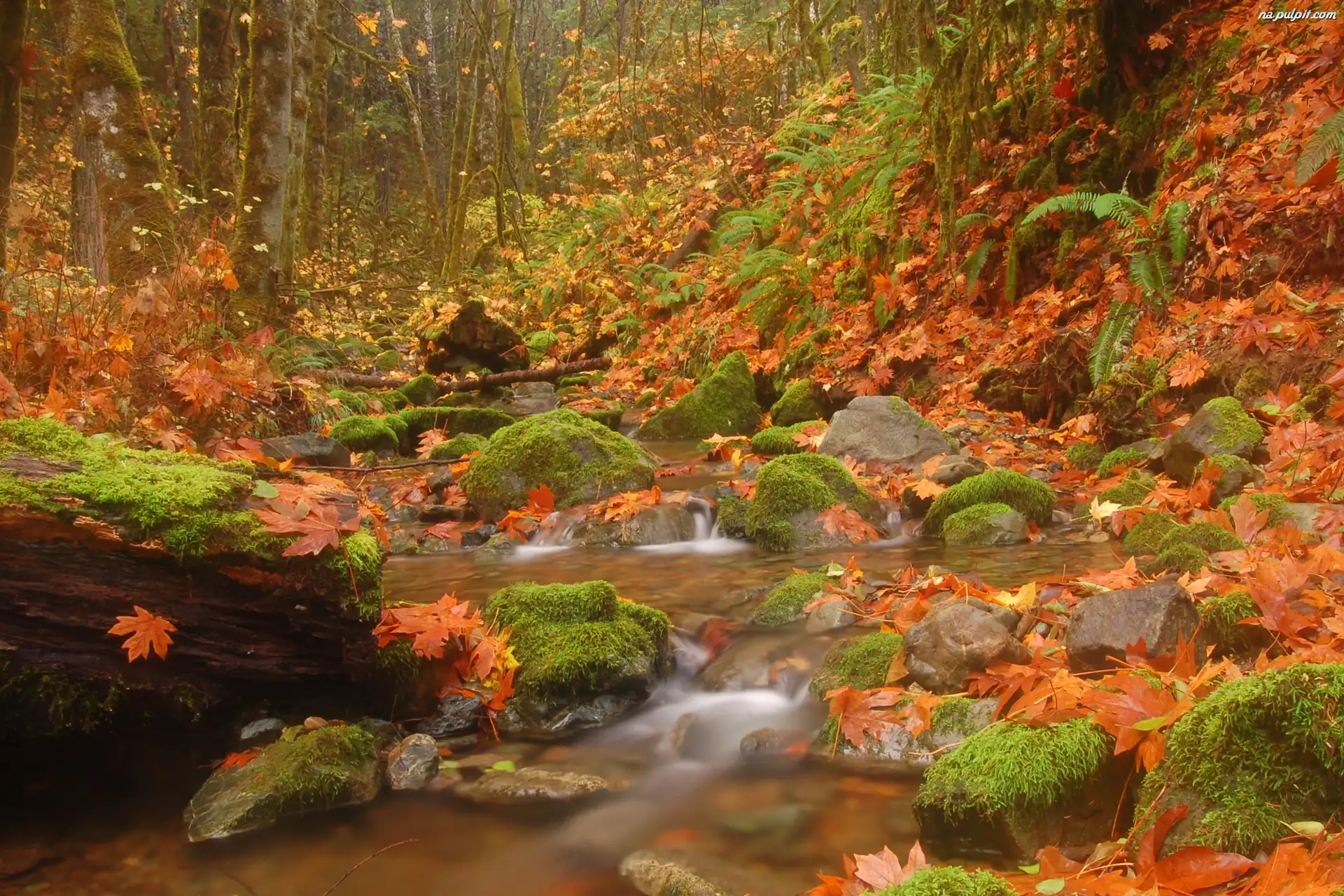 Rzeka, Żółte, Liście, Omszałe, Jesień. Las, Kamienie Na Pulpit