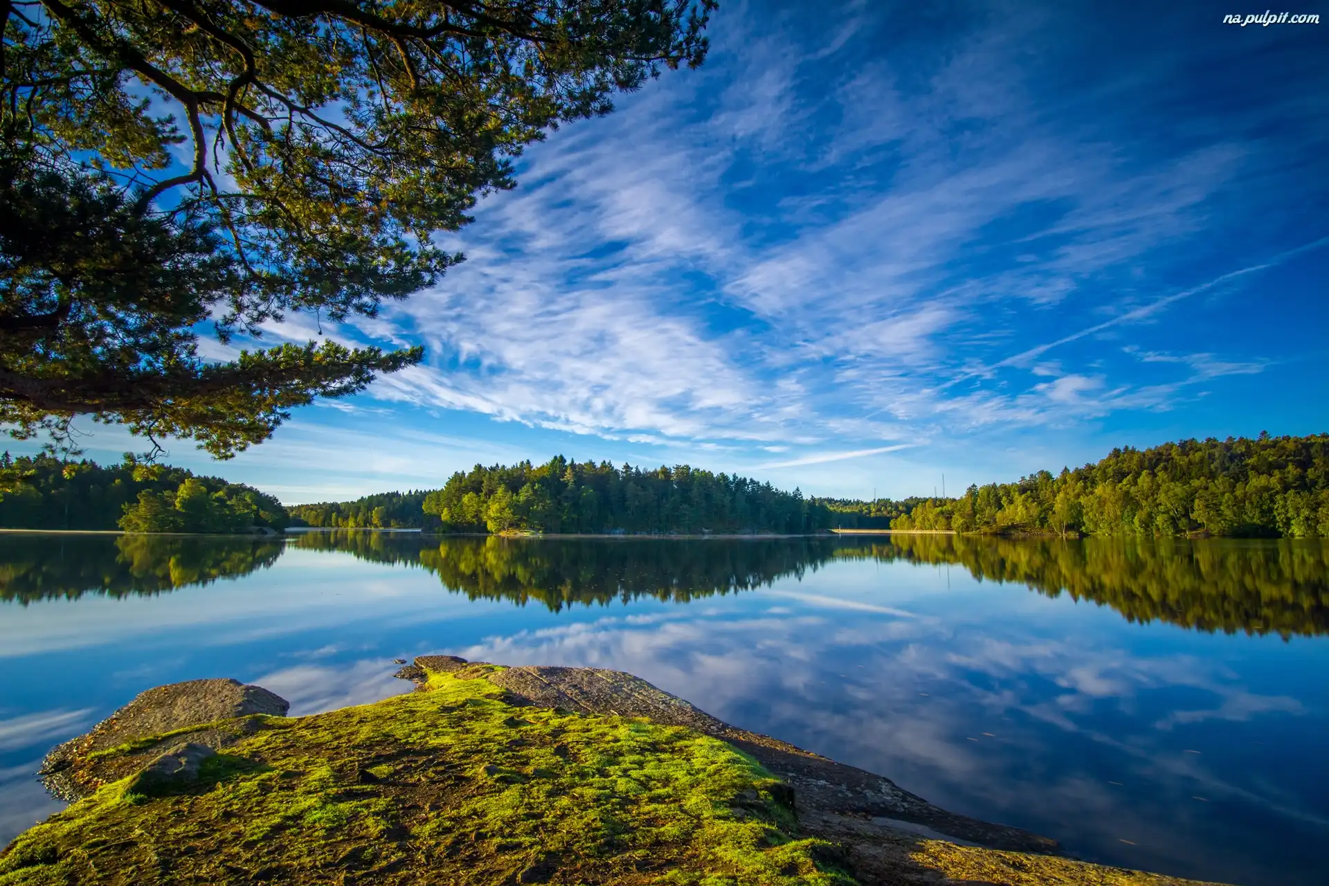 Omszała, Odbicie, Niebo, Skała, Jezioro, Drzewa Na Pulpit