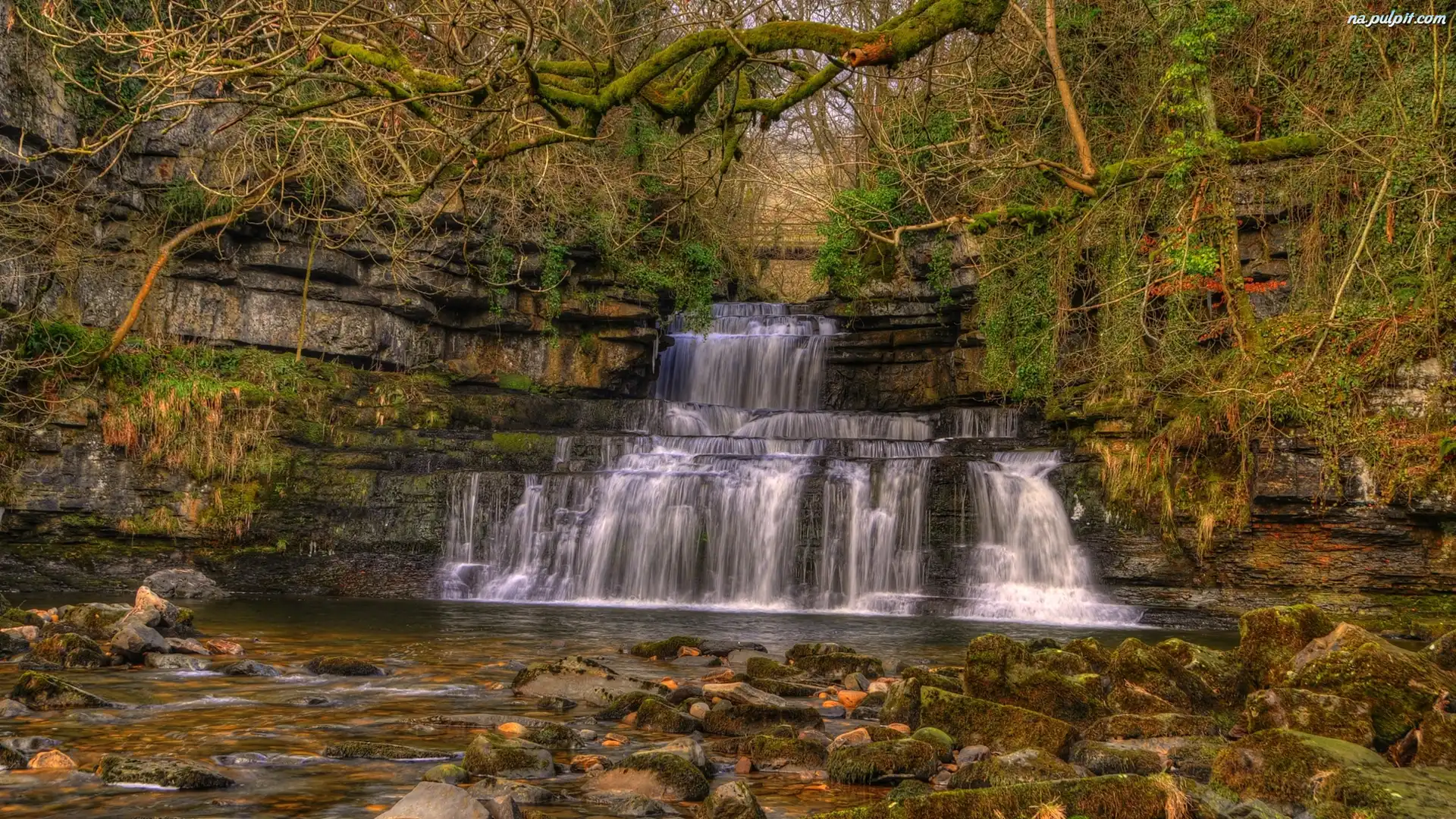 Omszałe, Park Narodowy Yorkshire Dales, Wodospad Cotter Force, Kamienie, Gałęzie, Rzeka Cotterdale Beck, Anglia, Skały Na Pulpit |