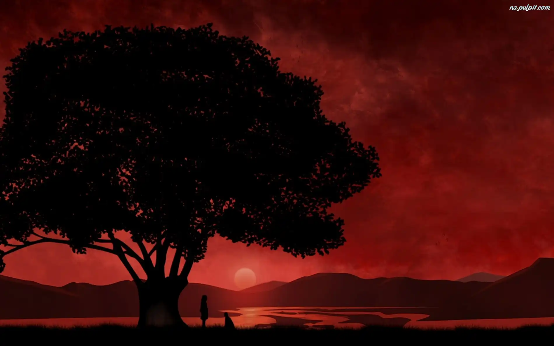 Ona, Drzewo, Słońca, Zachód, On