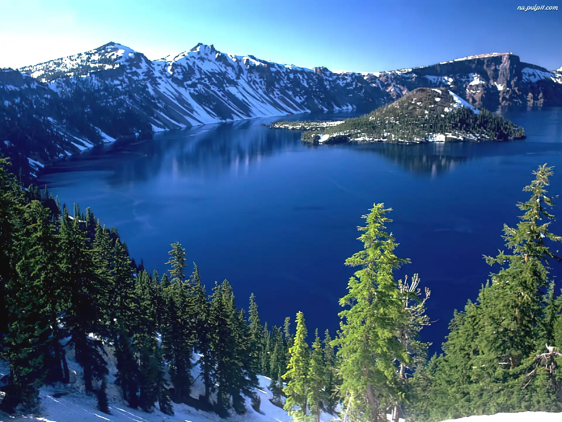 Śnieg, Drzewa, Jezioro, Oregon, Góry Na Pulpit