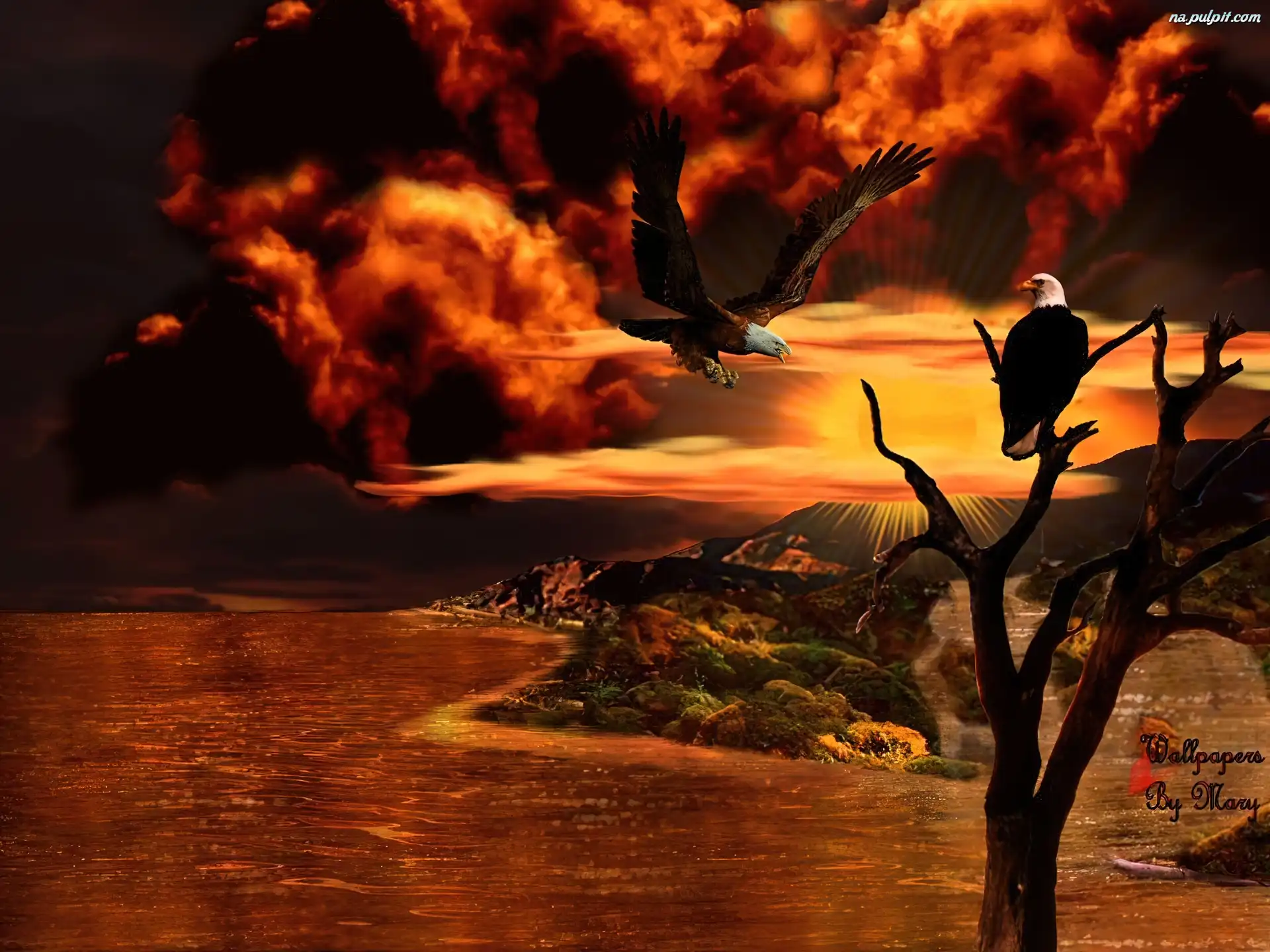 Bieliki amerykańskie, Zachód słońca, Chmury, Orły