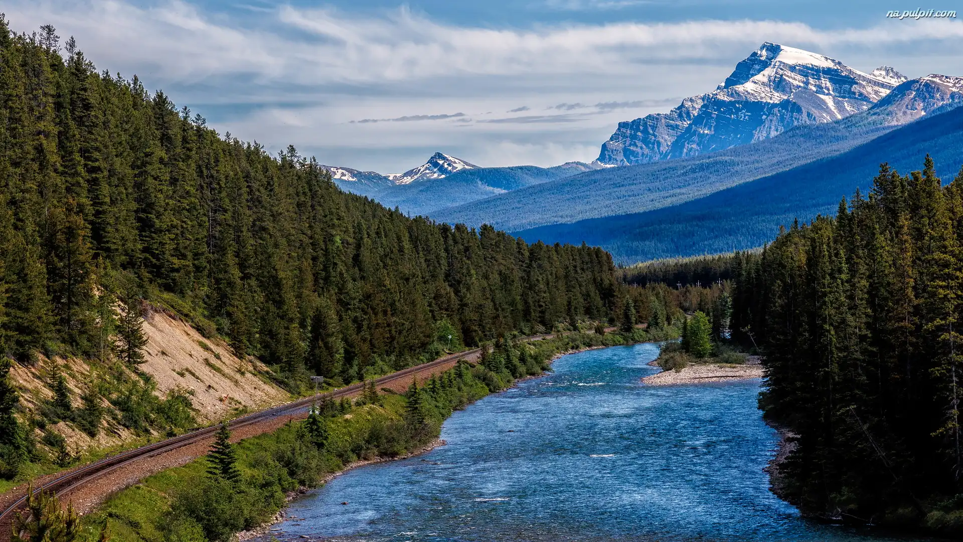 Ośnieżone, Drzewa, Kanada, Szczyty, Las, Tory kolejowe, Alberta, Park Narodowy Banff, Rzeka, Góry Skaliste, Bow River Na Pulpit |