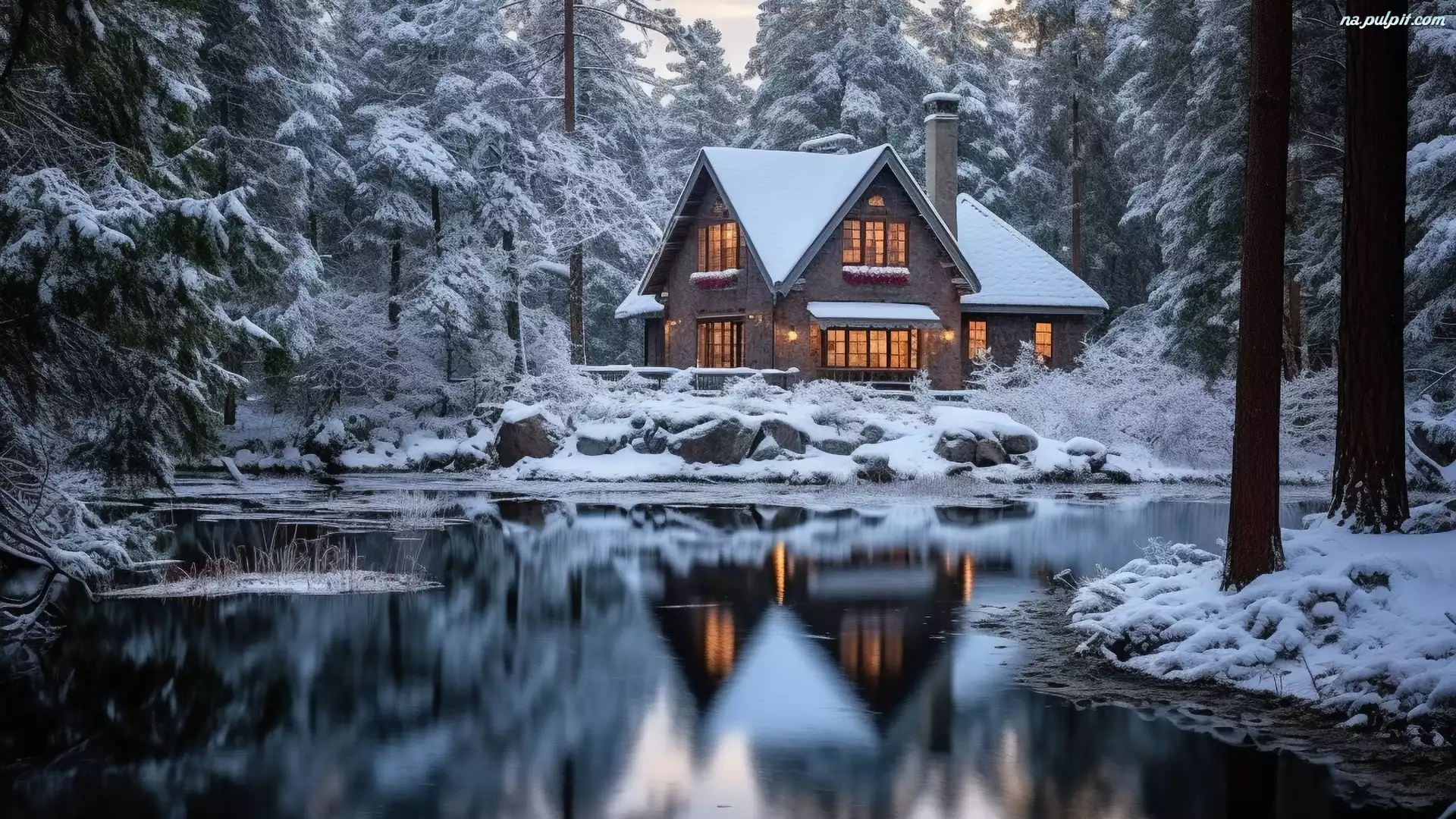 Drzewa, Las, Dom, Zima, Jezioro, Oświetlony, Śnieg, Ośnieżone Na Pulpit