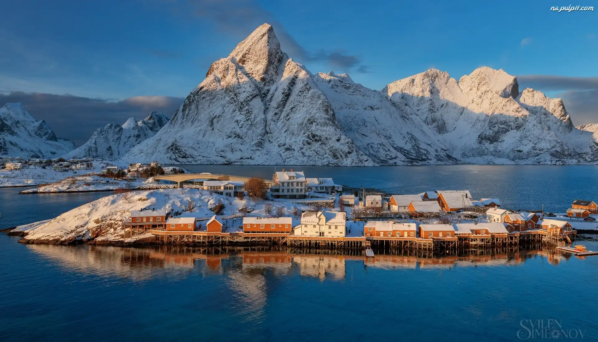 Norwegia, Ośnieżone, Lofoty, Wioska Hamnoy, Góry, Morze, Domy Na Pulpit