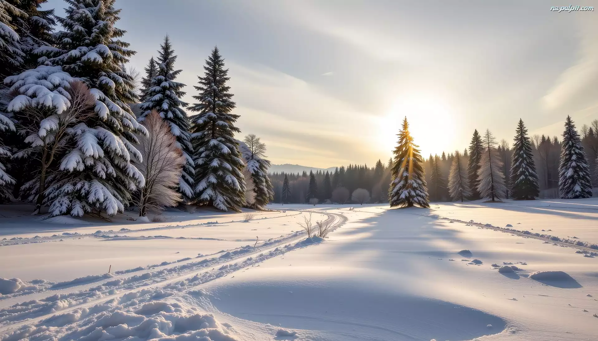 Pole, Zima, Drzewa, Ośnieżone, Świerki, Grafika AI Na Pulpit