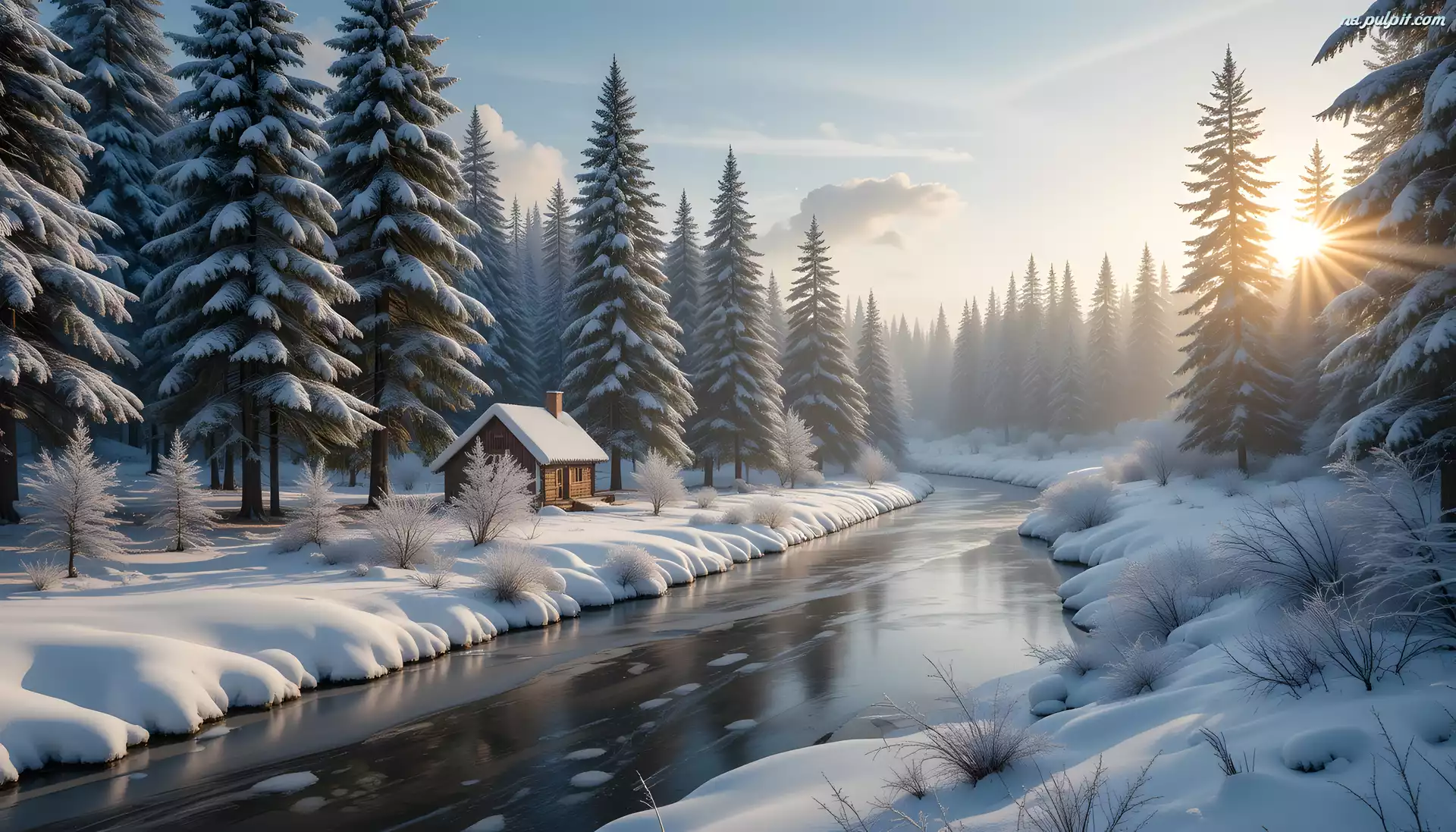 Ośnieżone, Dom, Drzewa, Zima, Promienie słońca, Krzewy, Rzeka, Las