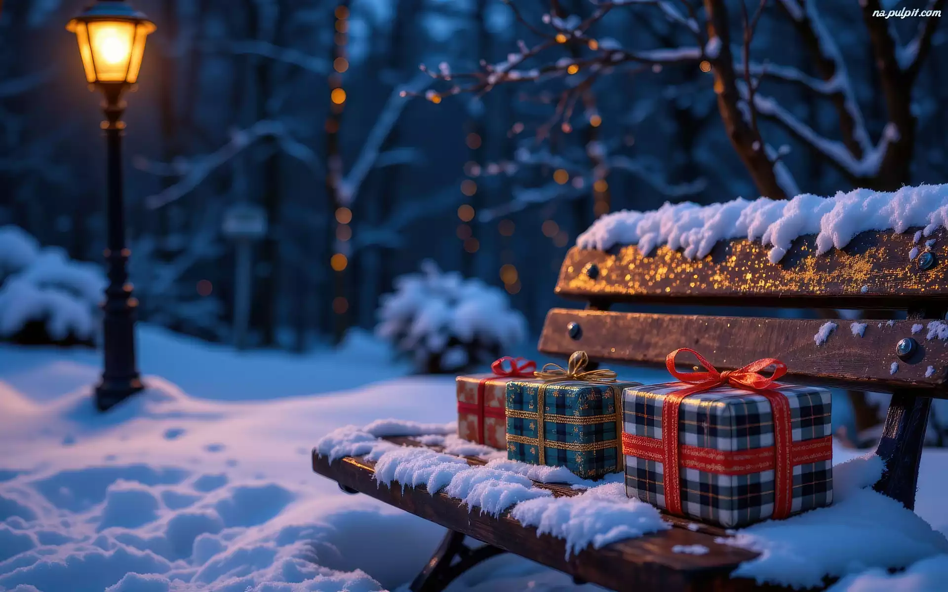 Drzewa, Park, Ławka, Zima, Latarnia, Prezenty, Noc, Ośnieżone Na Pulpit