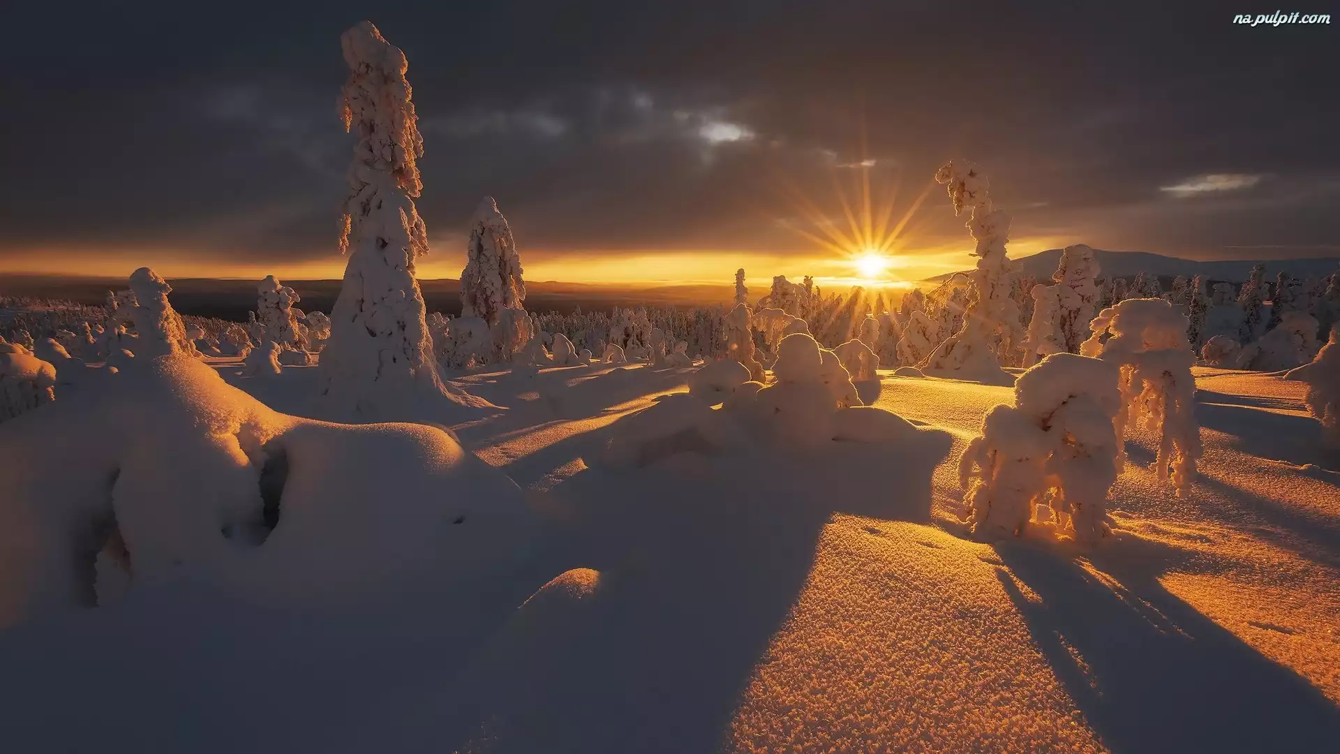 Drzewa, Zima, Śnieg, Ośnieżone, Wschód słońca, Chmury Na Pulpit
