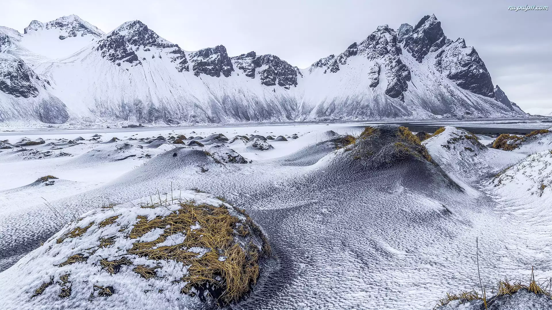 Szczyty, Hofn, Góry, Plaża Stokksnes, Zima, Góra Vestrahorn, Islandia, Ośnieżone Na Pulpit