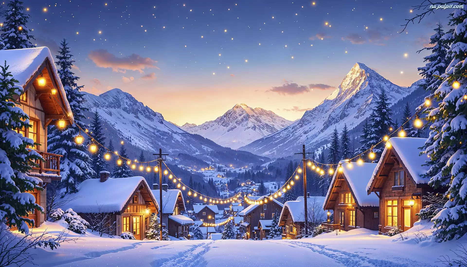 Grafika, Zima, Ulica, Ośnieżone, Domy, Oświetlenie, Góry Na Pulpit