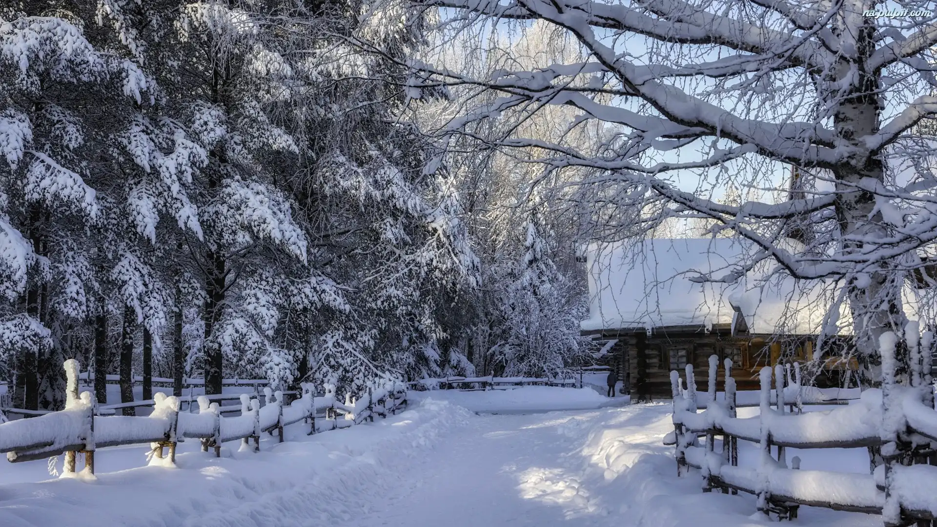 Ośnieżone, Ogrodzenie, Dom, Drzewa, Zima, Las Na Pulpit