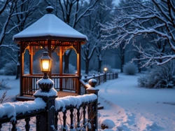 Ośnieżone, Drzewa, Noc, Altana, Śnieg, Park, Zima, Lampion, Ogrodzenie