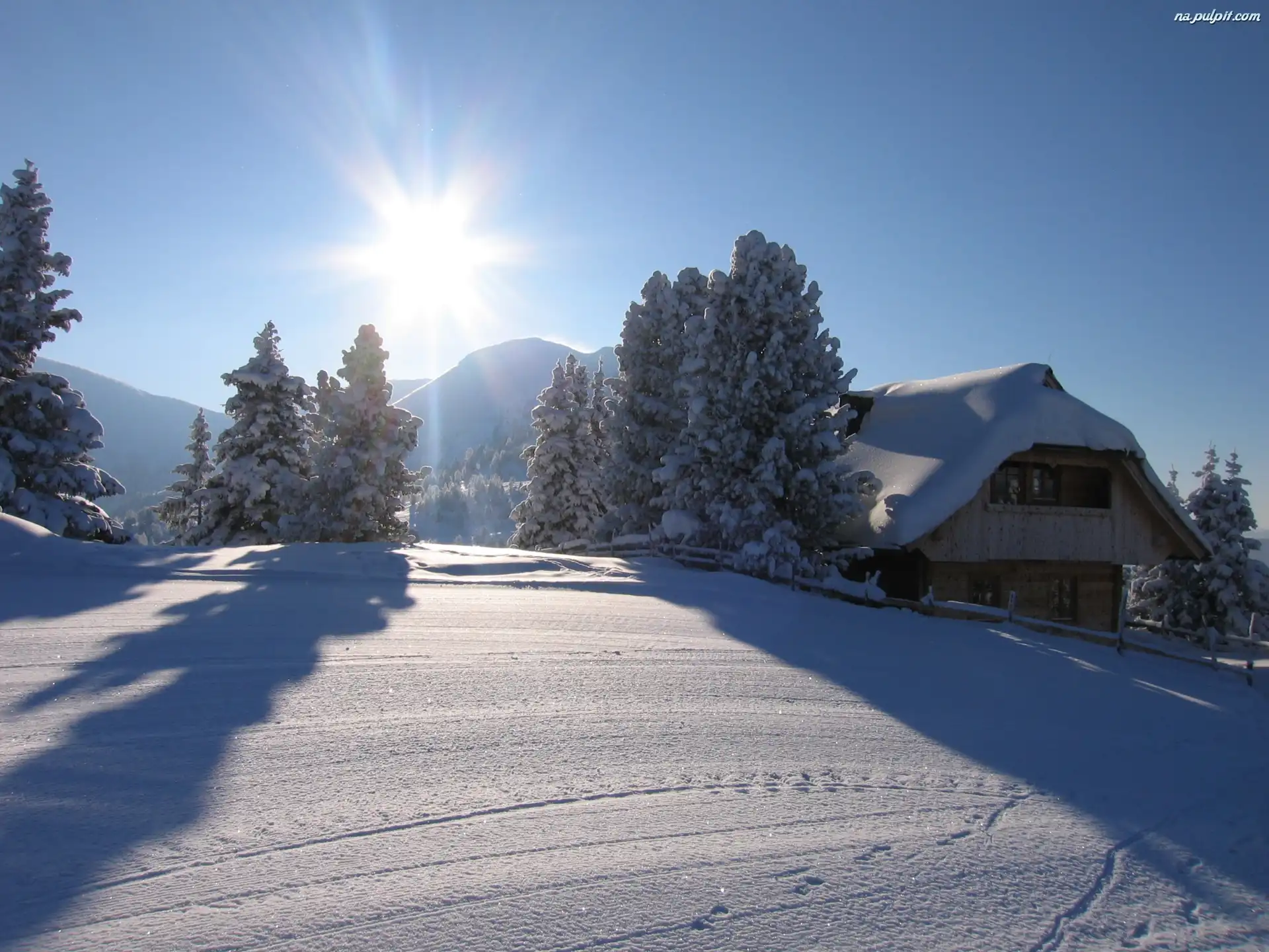 Ośnieżone, Przebijające, Światło, Drzewa, Zima, Dom Na Pulpit