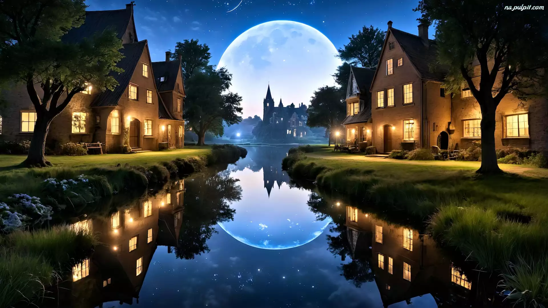 Noc, Domy, Księżyc, Grafika, Odbicie, Drzewa, Rzeka, Oświetlone Na Pulpit