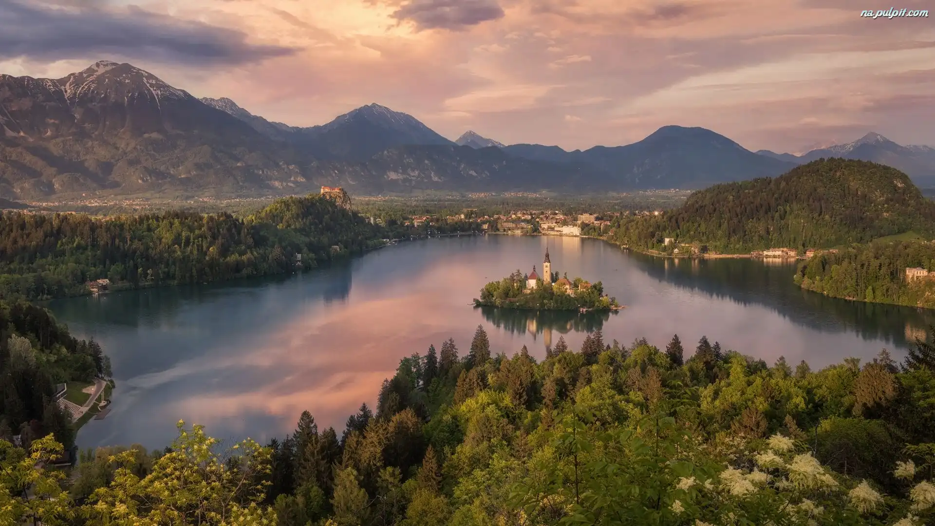 Wyspa Blejski Otok, Chmury, Drzewa, Góry Alpy Julijskie, Słowenia, Jezioro Bled Na Pulpit