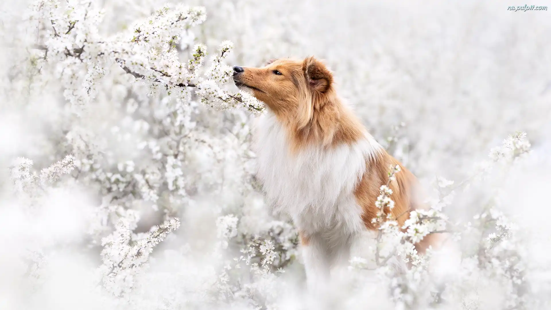 Drzewo owocowe, Pies, Owczarek szetlandzki, Kwiaty, Gałązki Na Pulpit