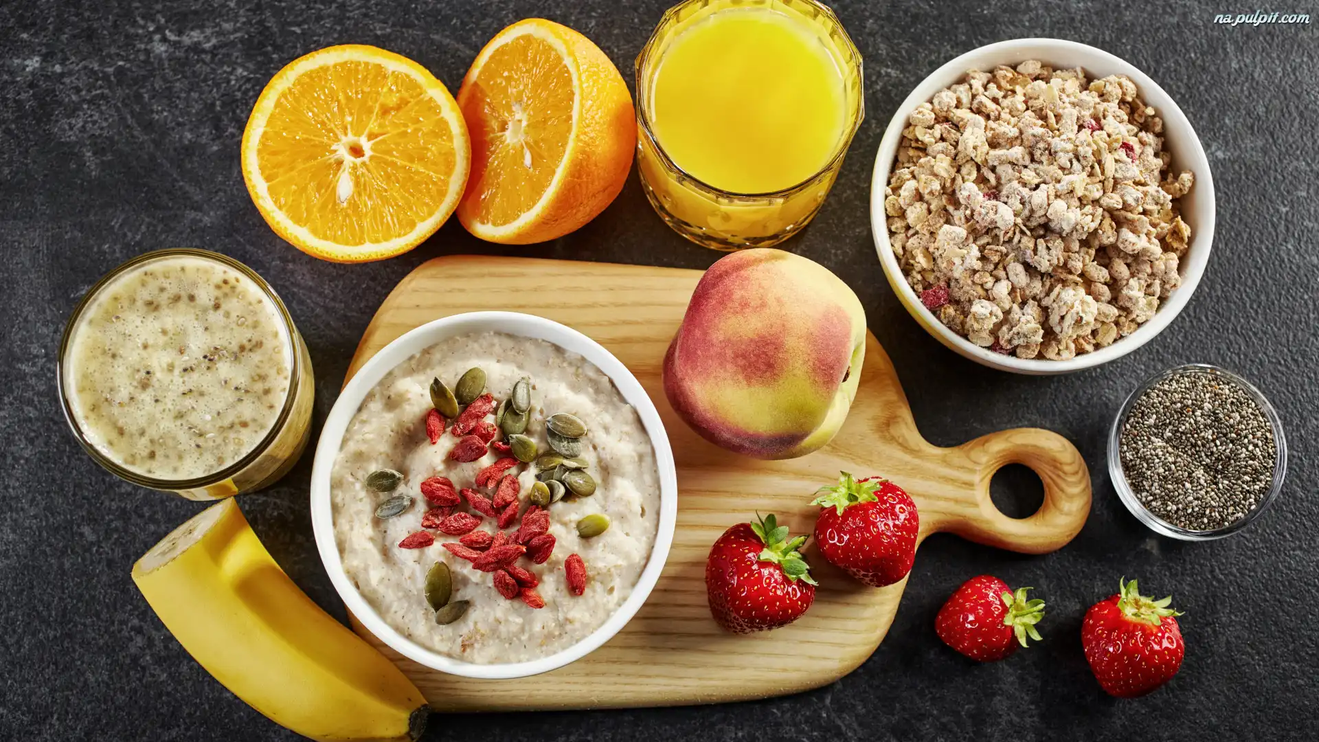 Owsianka, Owoce, Pomarańcza, Napoje, Śniadanie, Truskawki, Jedzenie, Brzoskwinia Na Pulpit