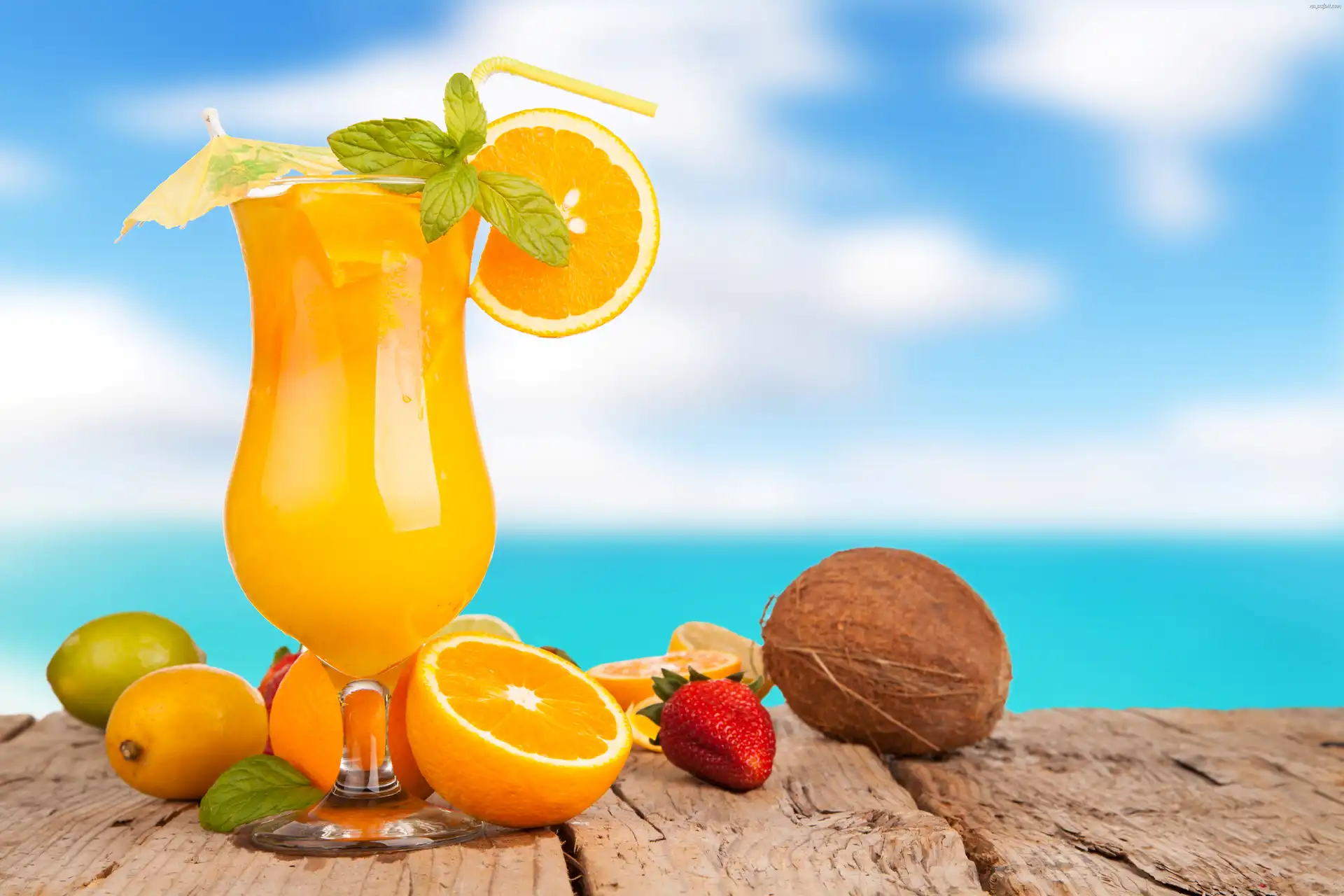 Owoce, Truskawka, Pomarańcza, Kokos, Koktajl, Cytryna