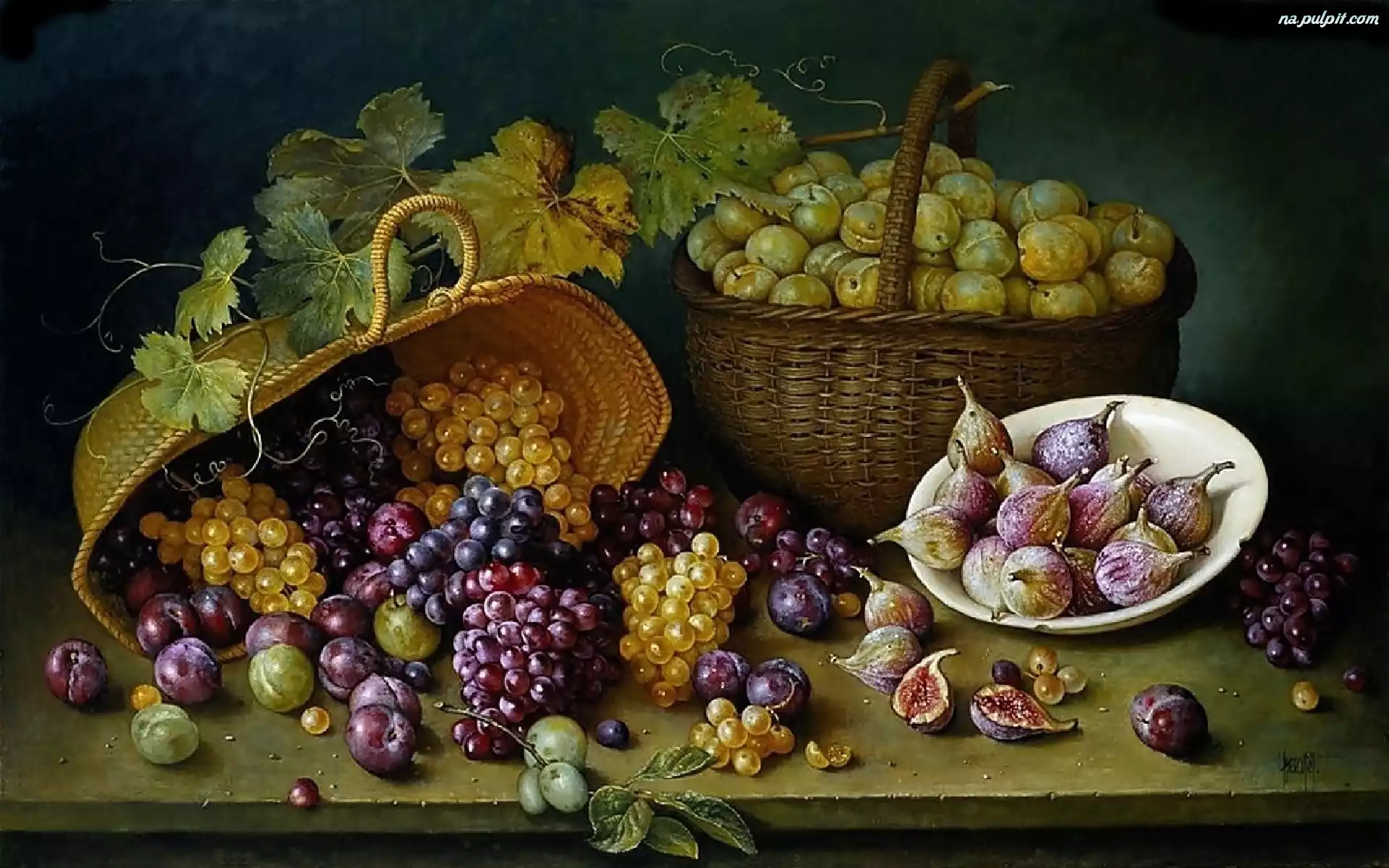 Śliwki, Kosze, Winogrona, Owoce, Stół Na Pulpit